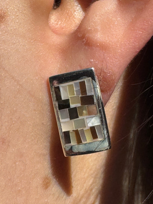 RECTANGEL BROWN AND WHITE MOTHER OF PEARL STERLING EARRINGS -POST