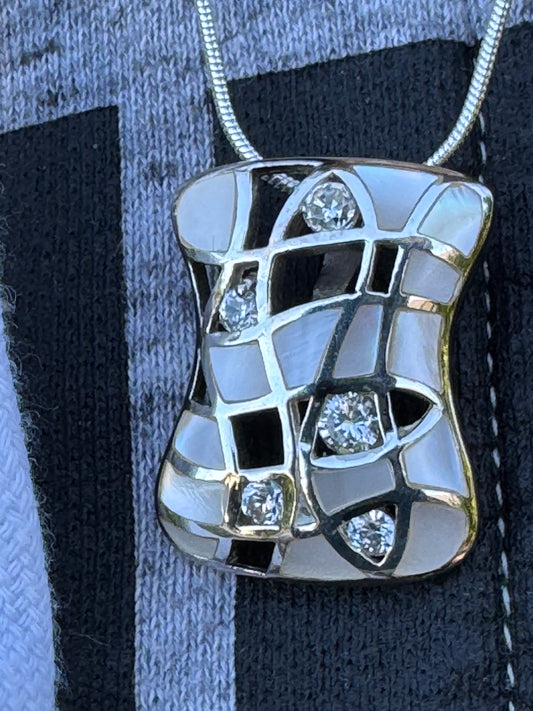 EVNING DRESSING-WHITE MOTHER OF PEARL PLUS CLEAR CRYSTALS STERLING NECKLACE