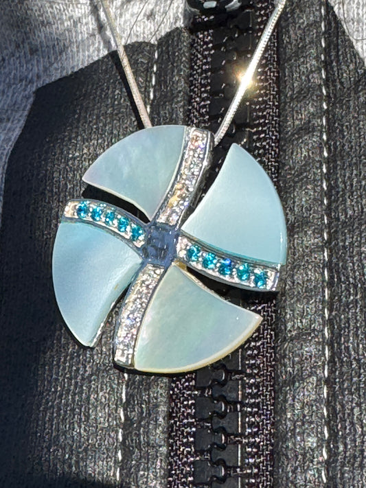 BIG WHITE AND BLUE MOTHER OF PEARL WITH WHITE AND BLUE CRYSTALS STERLING NECKLACE