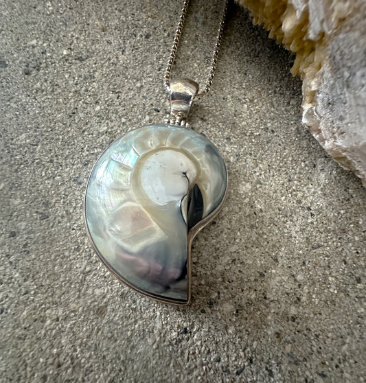 Amonite Pendant on Moonstone Beaded Sterling Silver Necklace