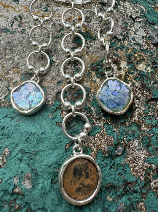 Ancient Roman Glass & Roman Coin Sterling Silver Necklace