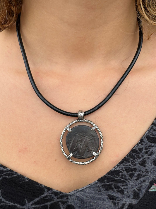 Big "M" Ancient Roman Coin Round Leather Necklace