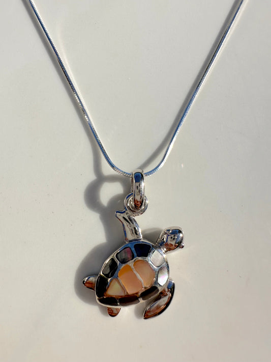 Mosaic Turtle Sterling Silver Necklace (Snake Chain)
