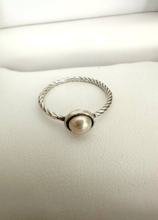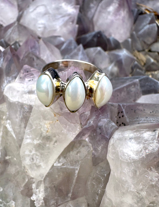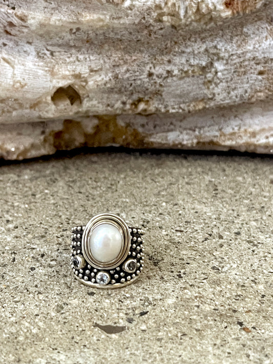 Wide Pearl & 3 Blue Topaz Sterling Silver Ring