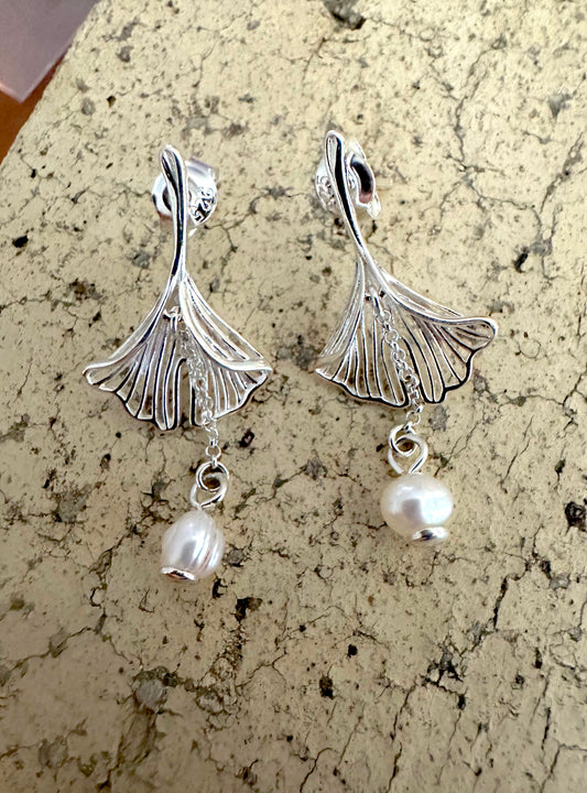 Wire Shell Teardrop Small White Pearl Sterling Silver Post Earrings