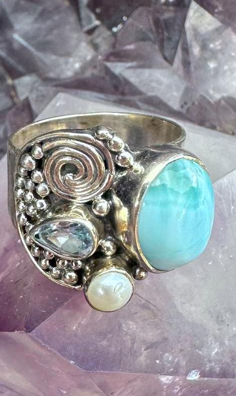 Larimar Blue Topaz & Pearl Sterling Silver Ring
