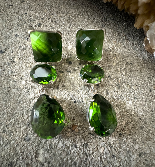 Green Obsidian 3 Faceted Stones Sterling Silver Earrings