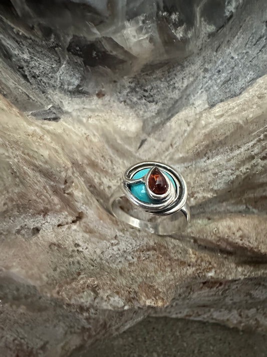 Round Turquoise and Teardrop Honey Amber Sterling Silver Ring