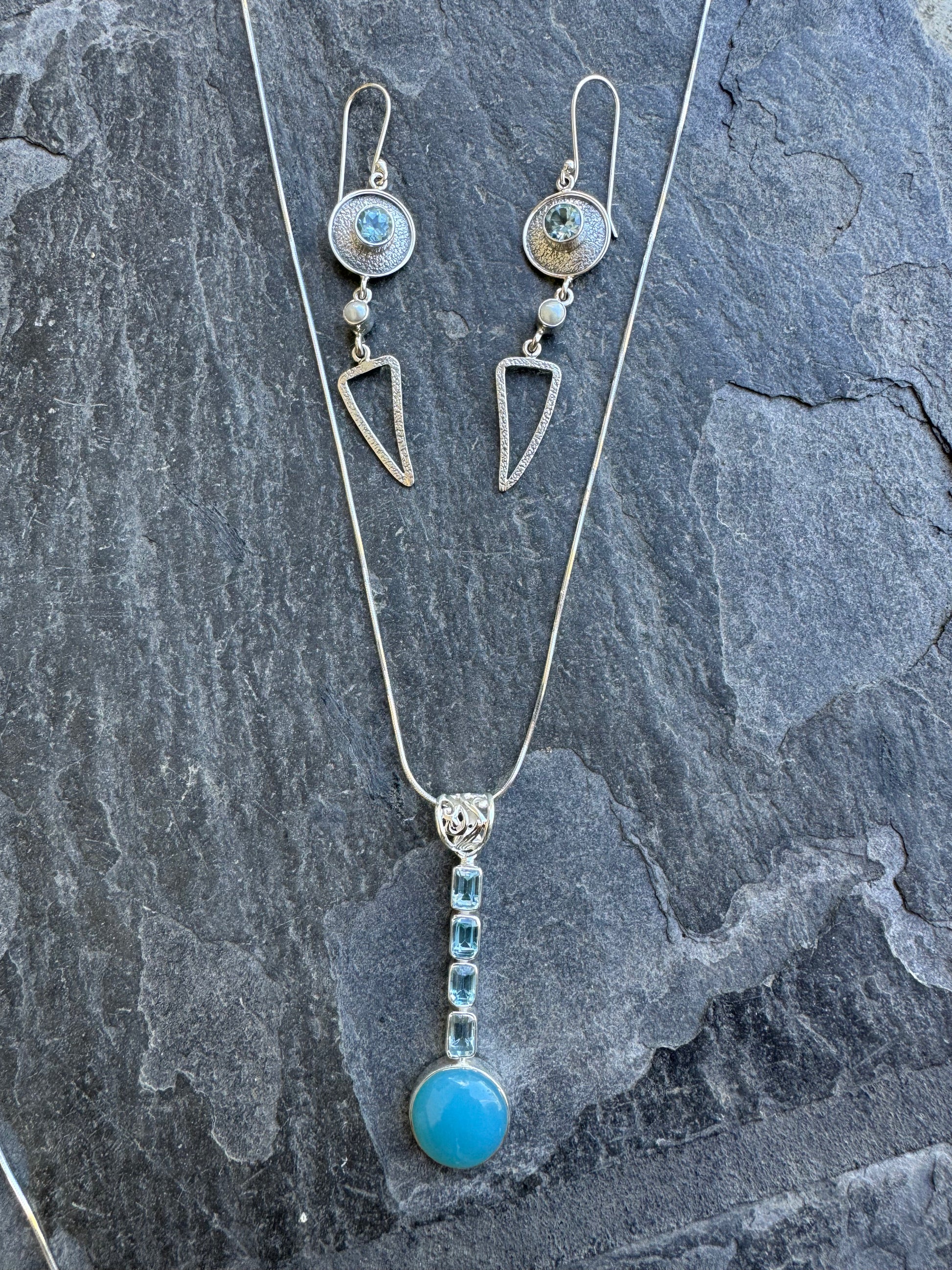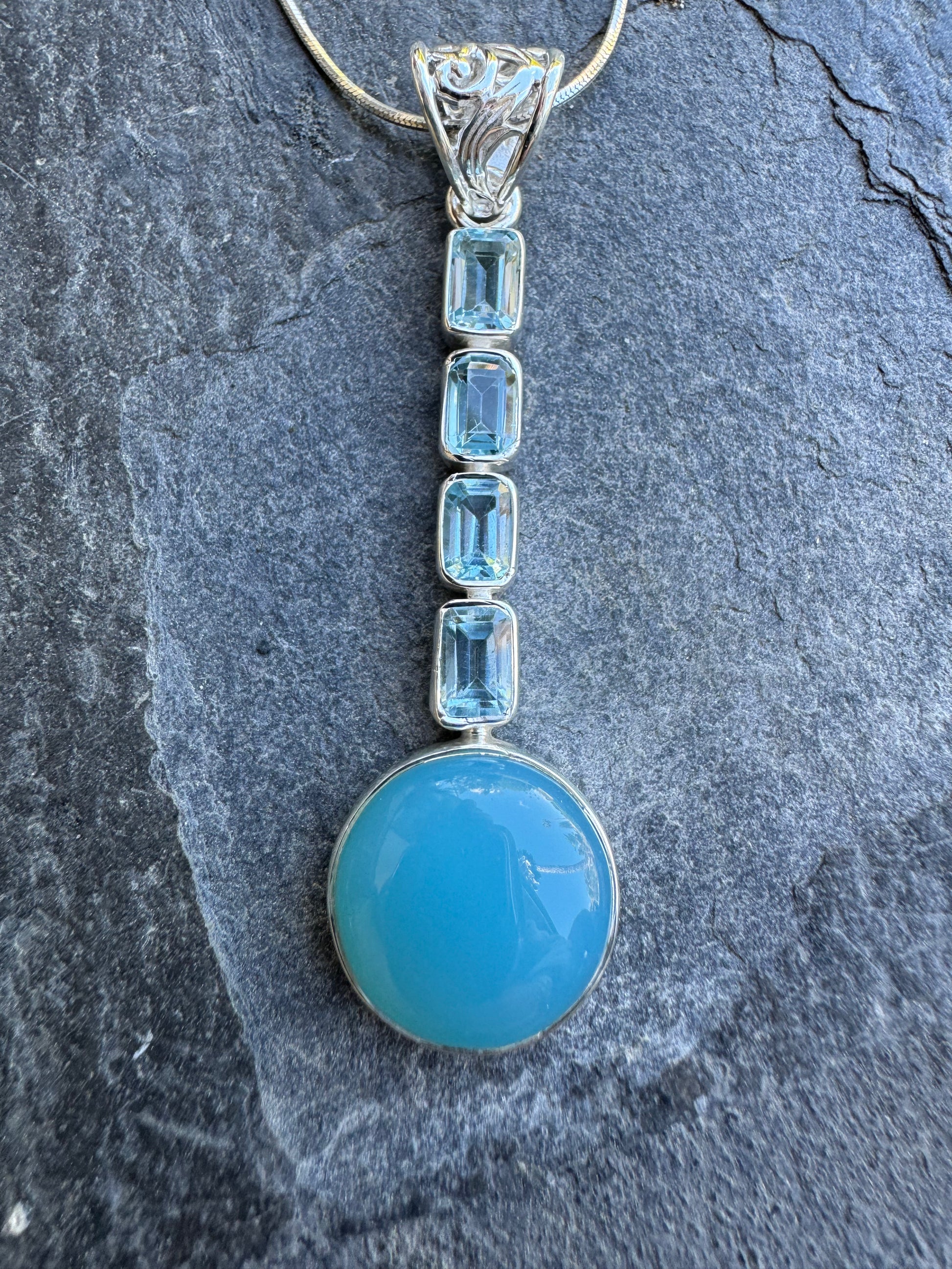 This stunning sterling silver necklace features a large, eye-catching blue Agate centerpiece, complemented by four sparkling Blue Topaz stones. The deep, vibrant hues of the blue agate symbolize calm and strength, while the Blue Topaz enhances clarity and communication.