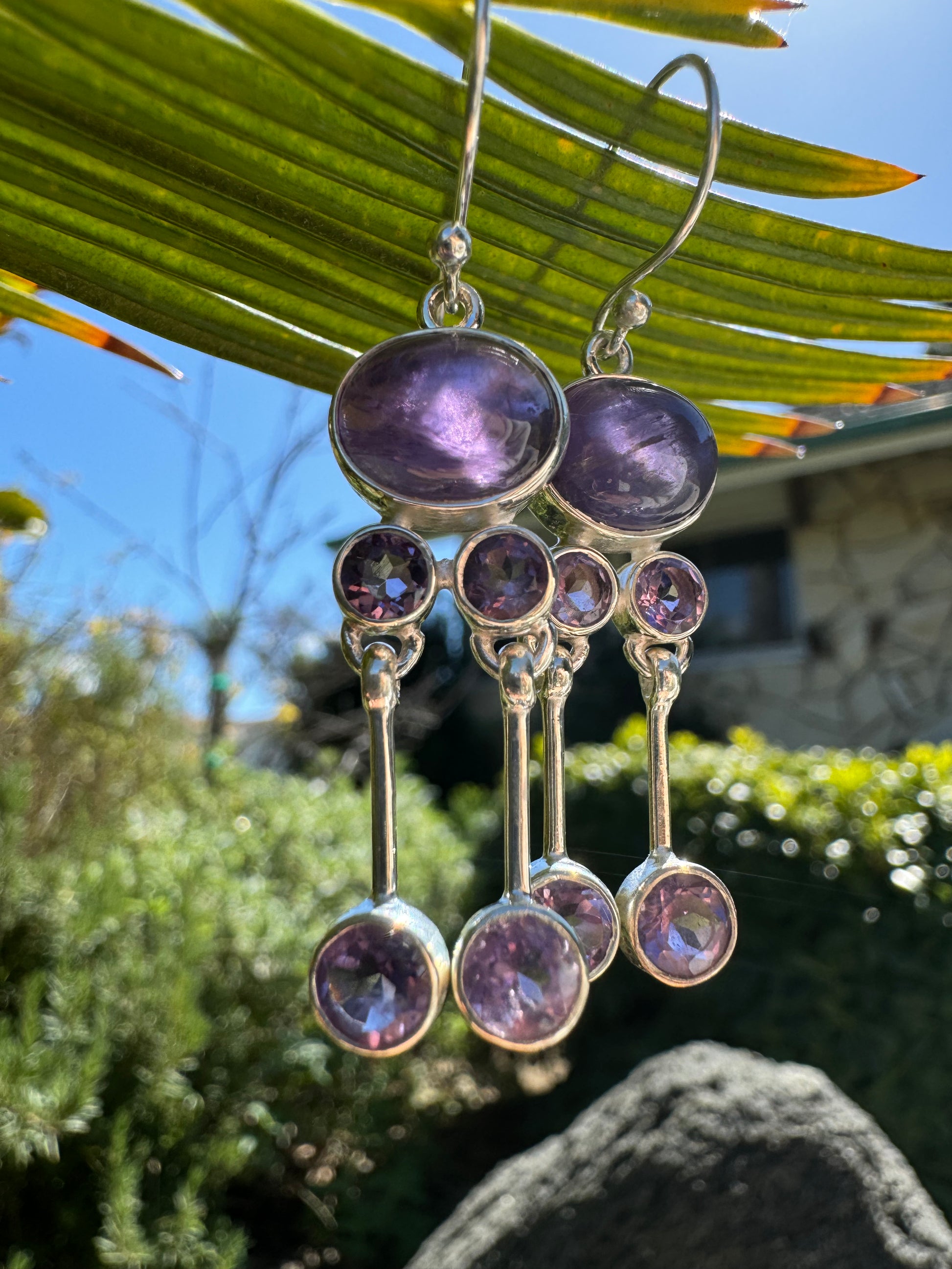 These sterling silver earrings feature a stunning oval cabochon amethyst paired with four small round and marquise-shaped amethysts, creating a cascading effect.