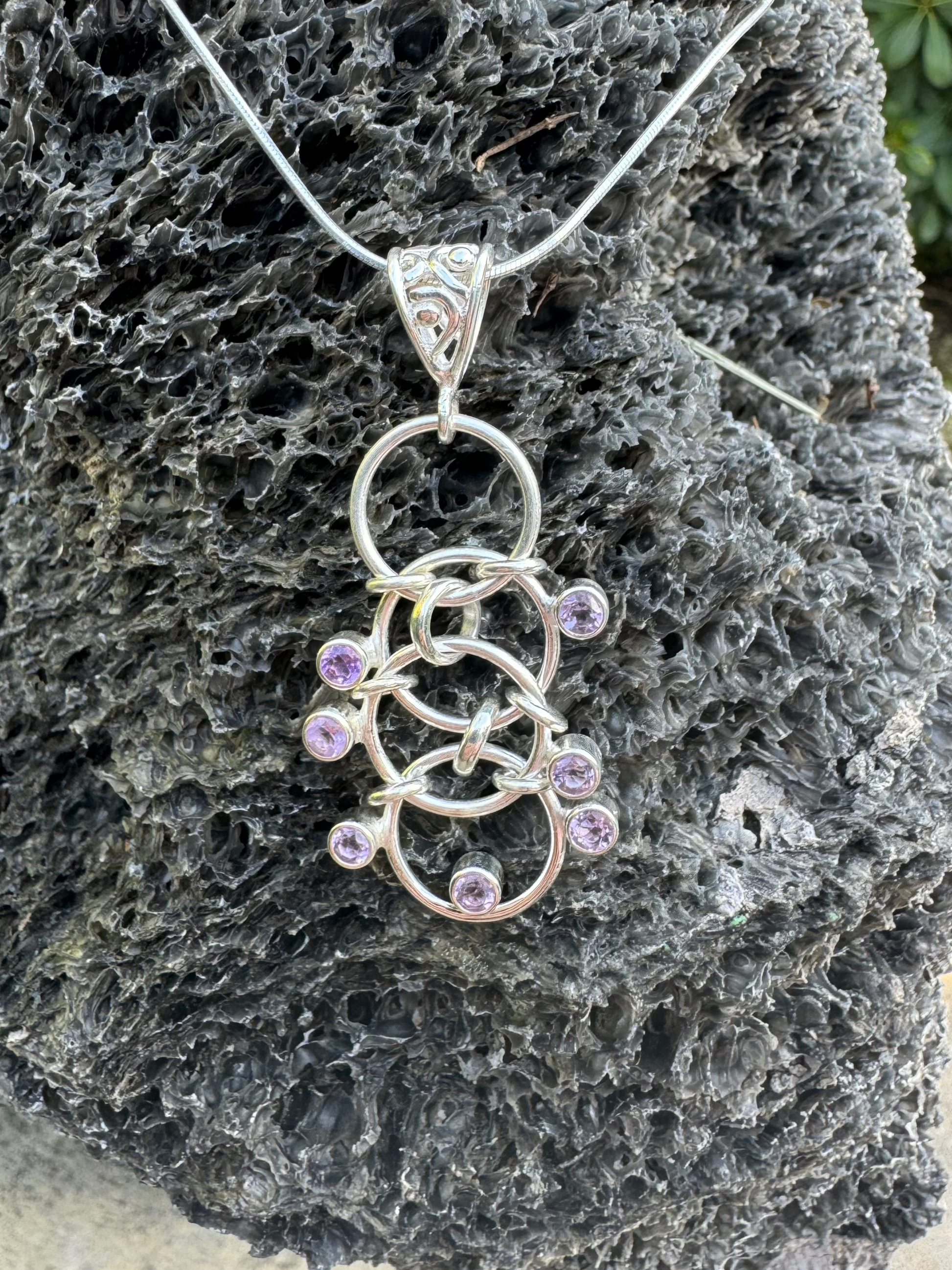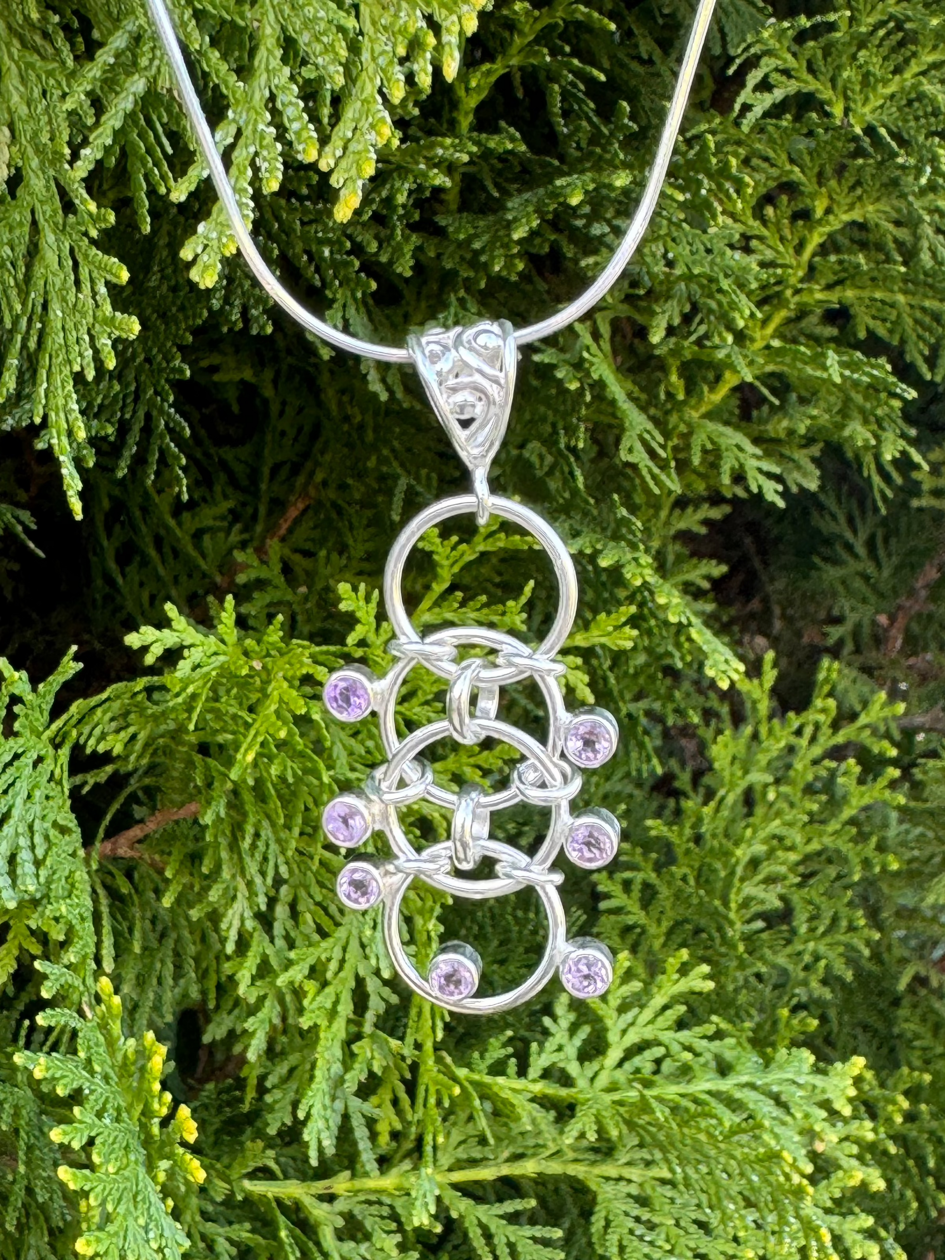A sterling silver necklace featuring seven radiant amethyst stones elegantly set on interconnected round circles, suspended from a shiny silver chain. Symbolizing harmony and balance, this piece exudes timeless charm and mystical beauty.