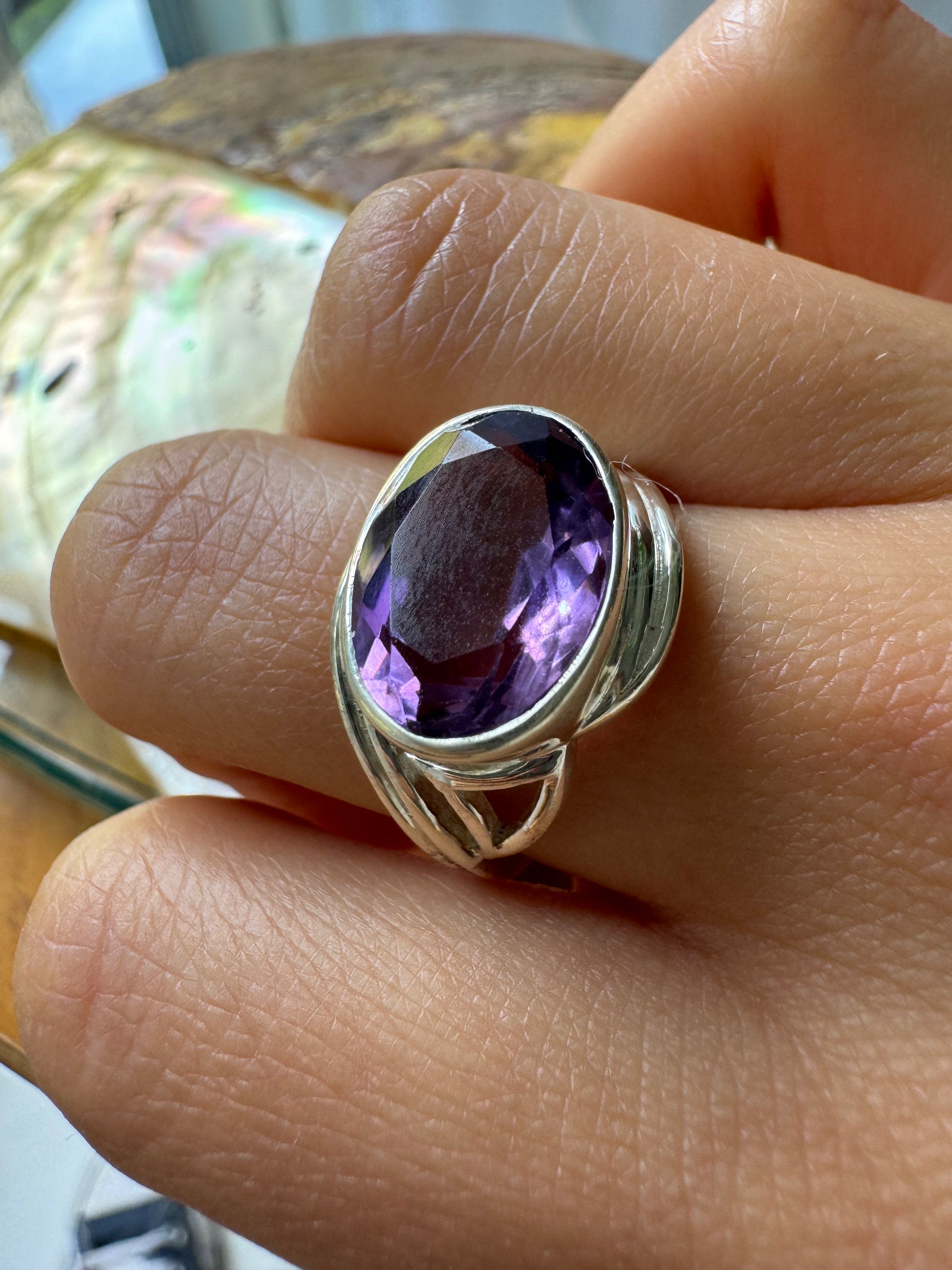 A Sterling Silver ring featuring a radiant oval Amethyst in an elegant Marquise-style setting.