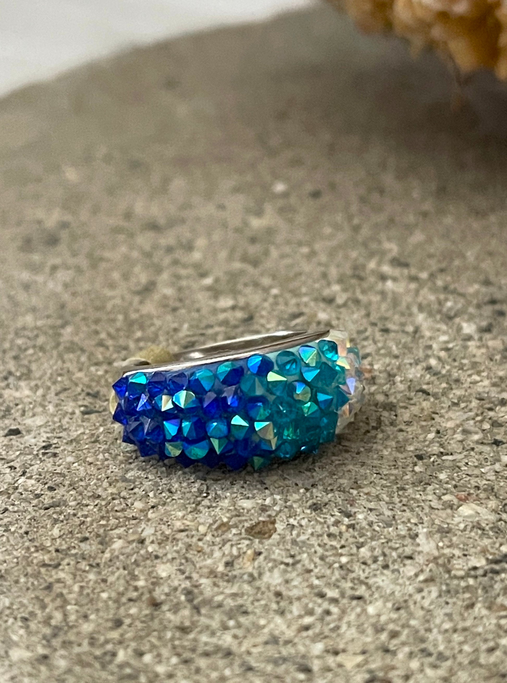 Blue, turquoise, & white Austrian Crystal sterling silver ring.