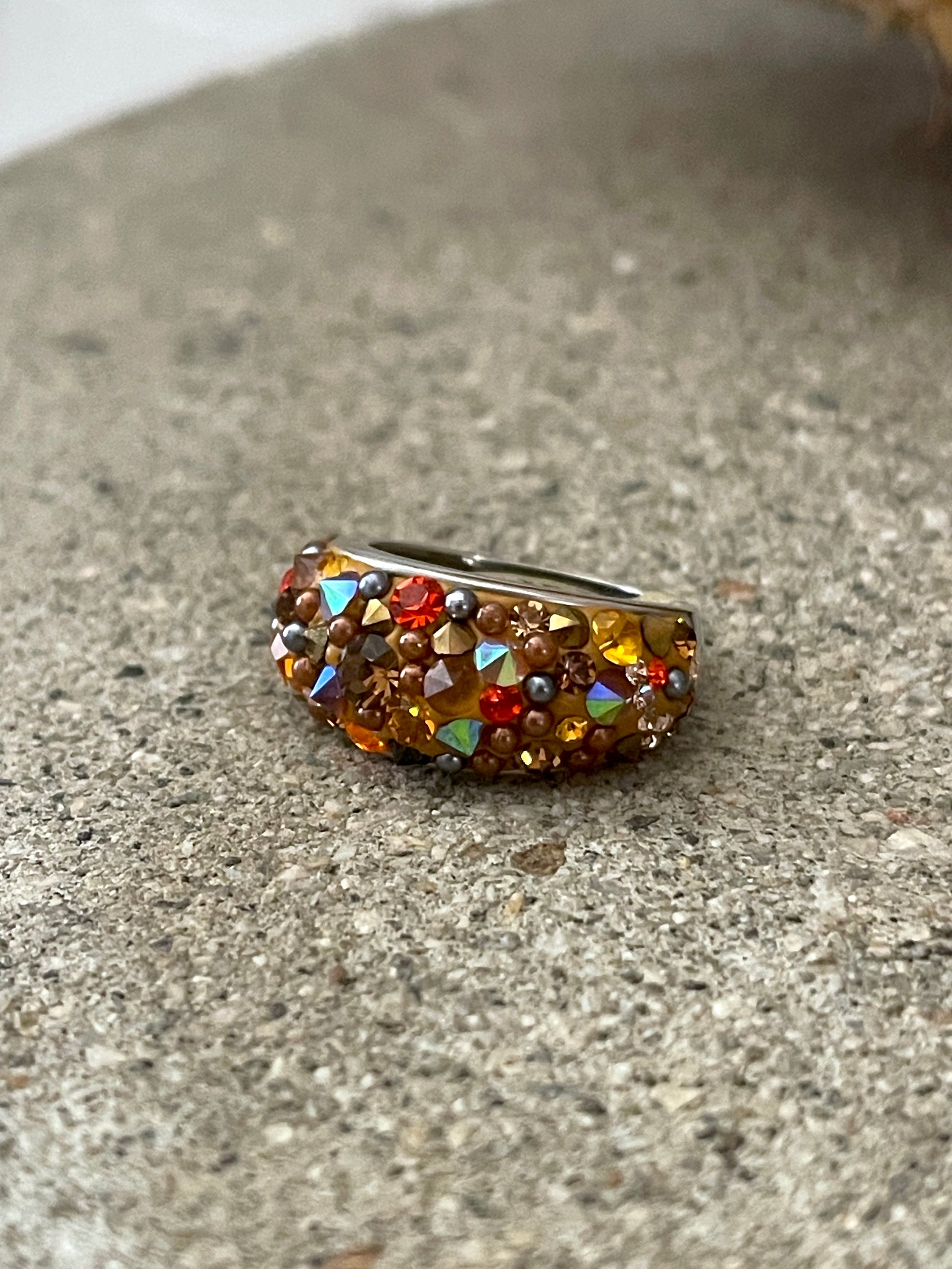 Bright multi-colored tan & orange Austrian Crystal sterling silver ring.