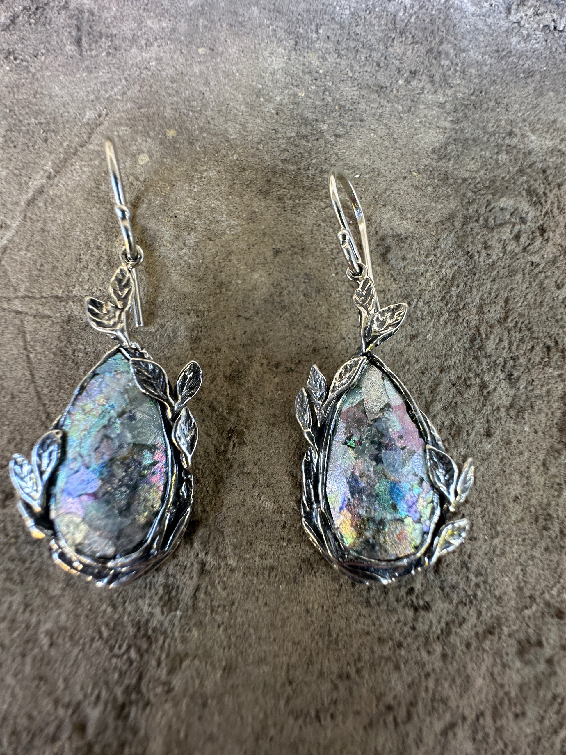 Sterling Silver & Ancient Roman Glass teardrop shaped patina framed in an ornate silver setting designed with branches and delicate leaves, giving the earrings an organic woodland feel.