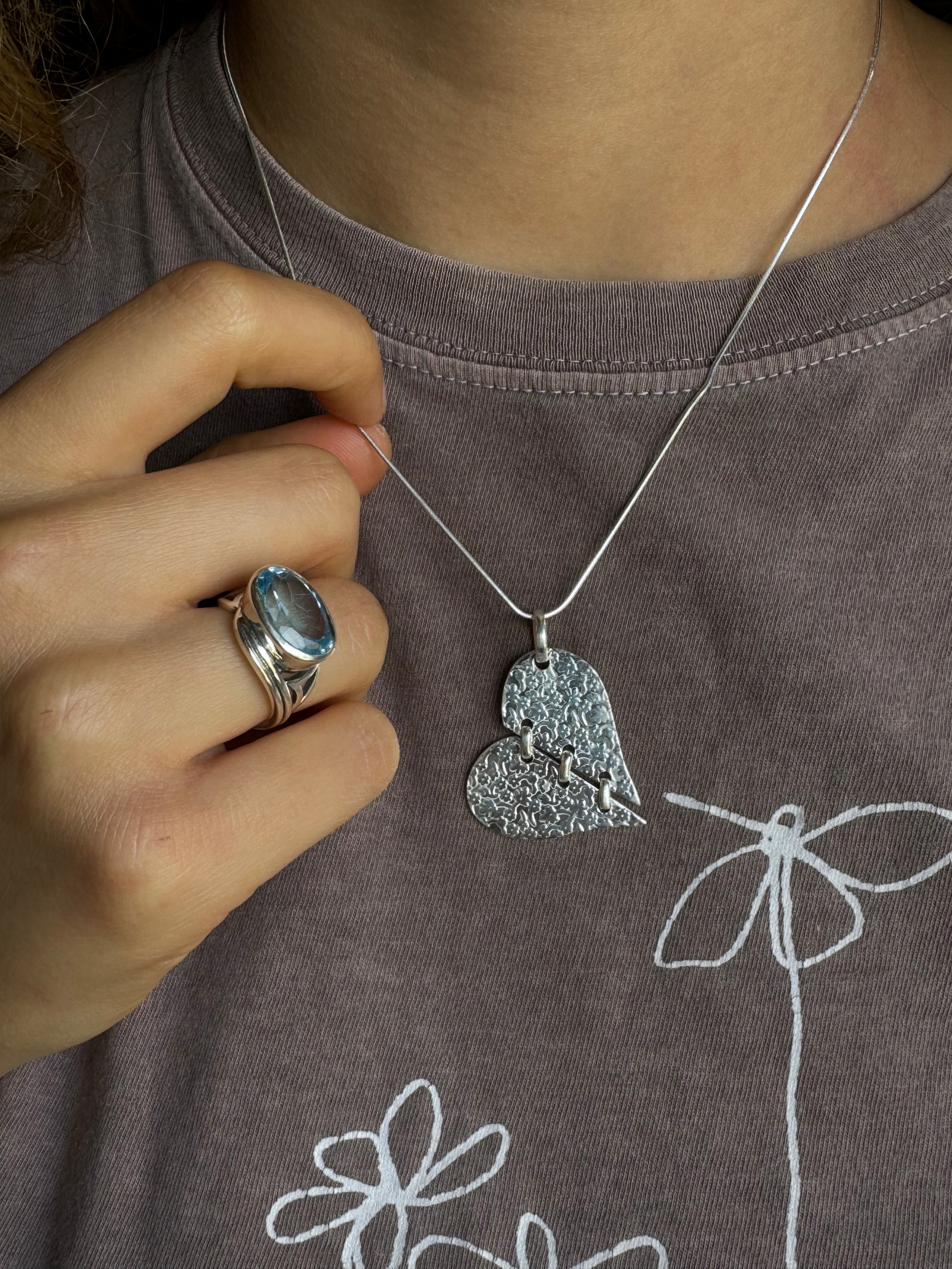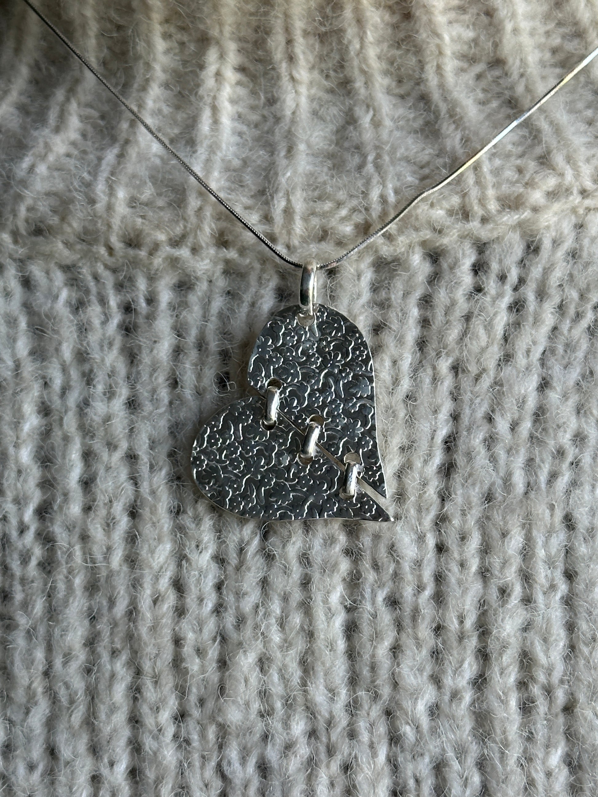This sterling silver necklace features a heart-shaped pendant, beautifully adorned with delicate floral details.