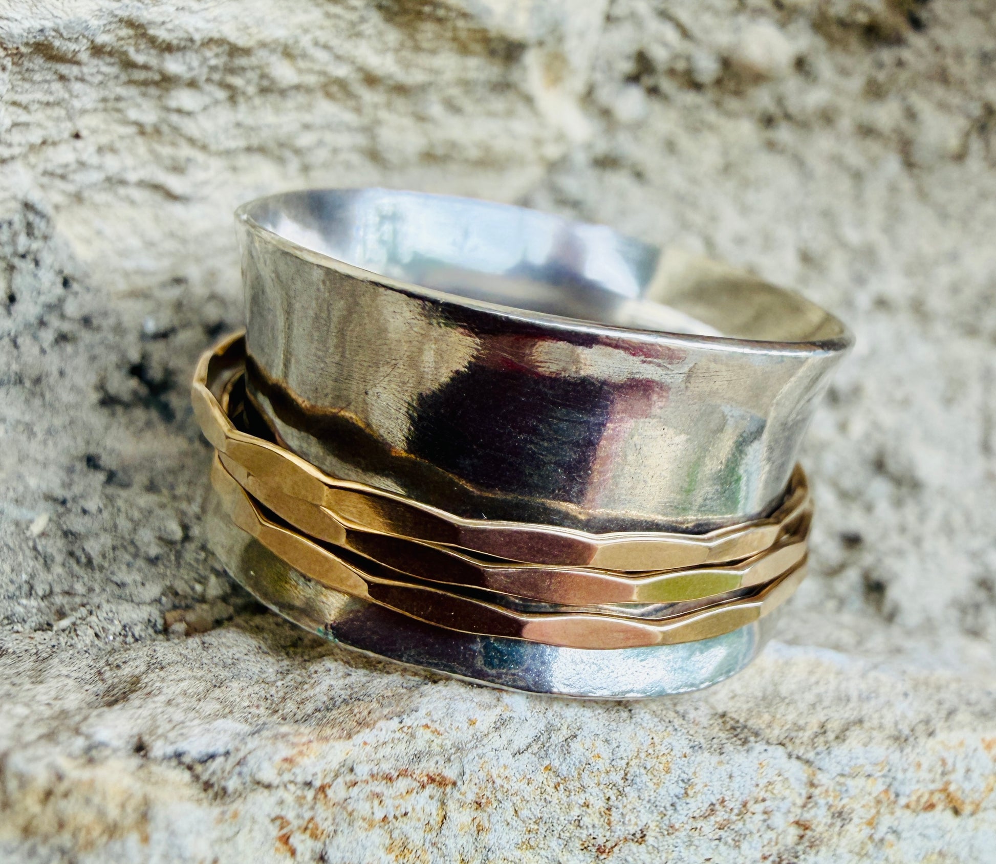 A wide silver band encircled by three flowing gold plated waves, like a current moving through still water. The contrast of metals gives it motion, depth, and a quietly powerful presence.
