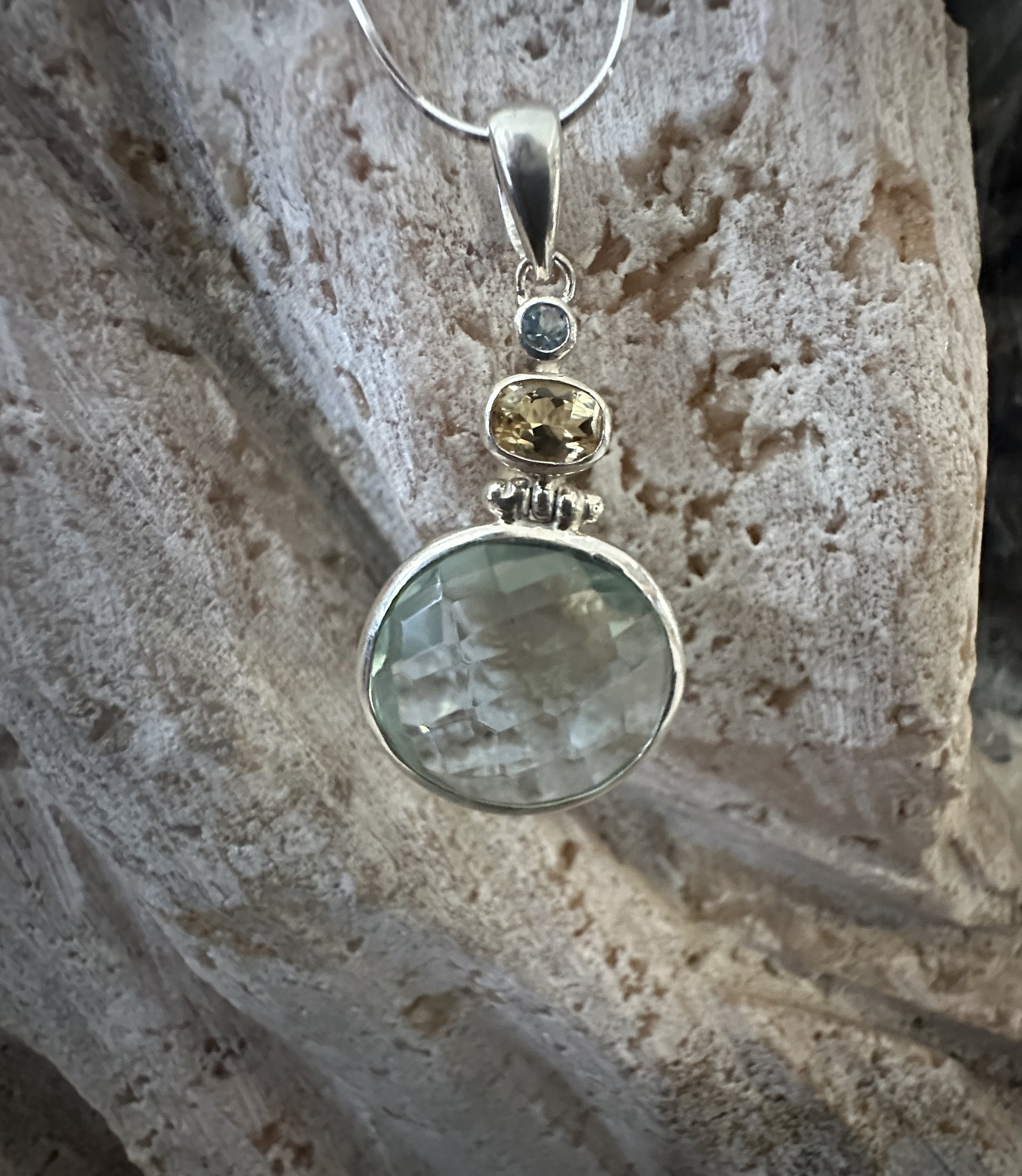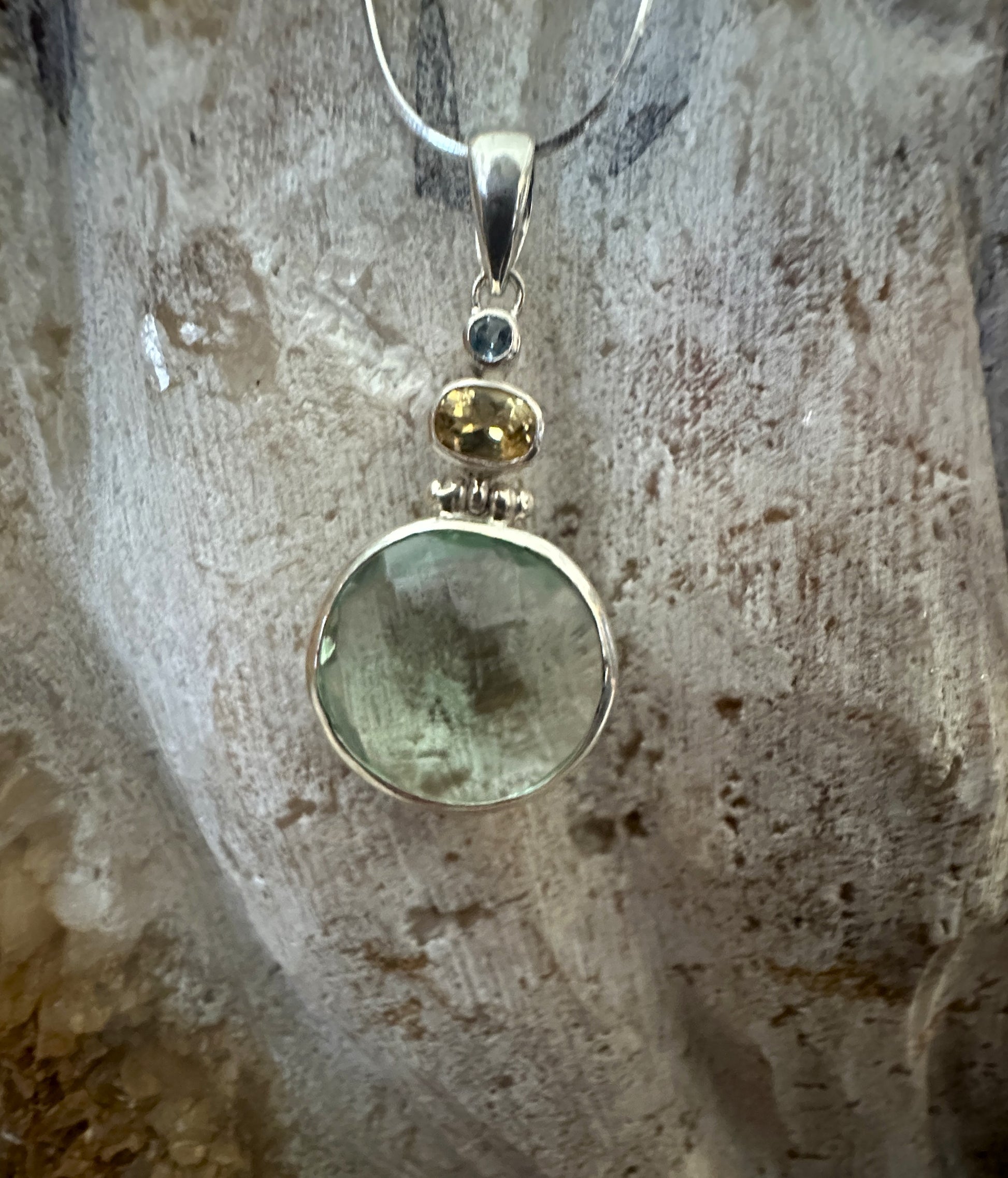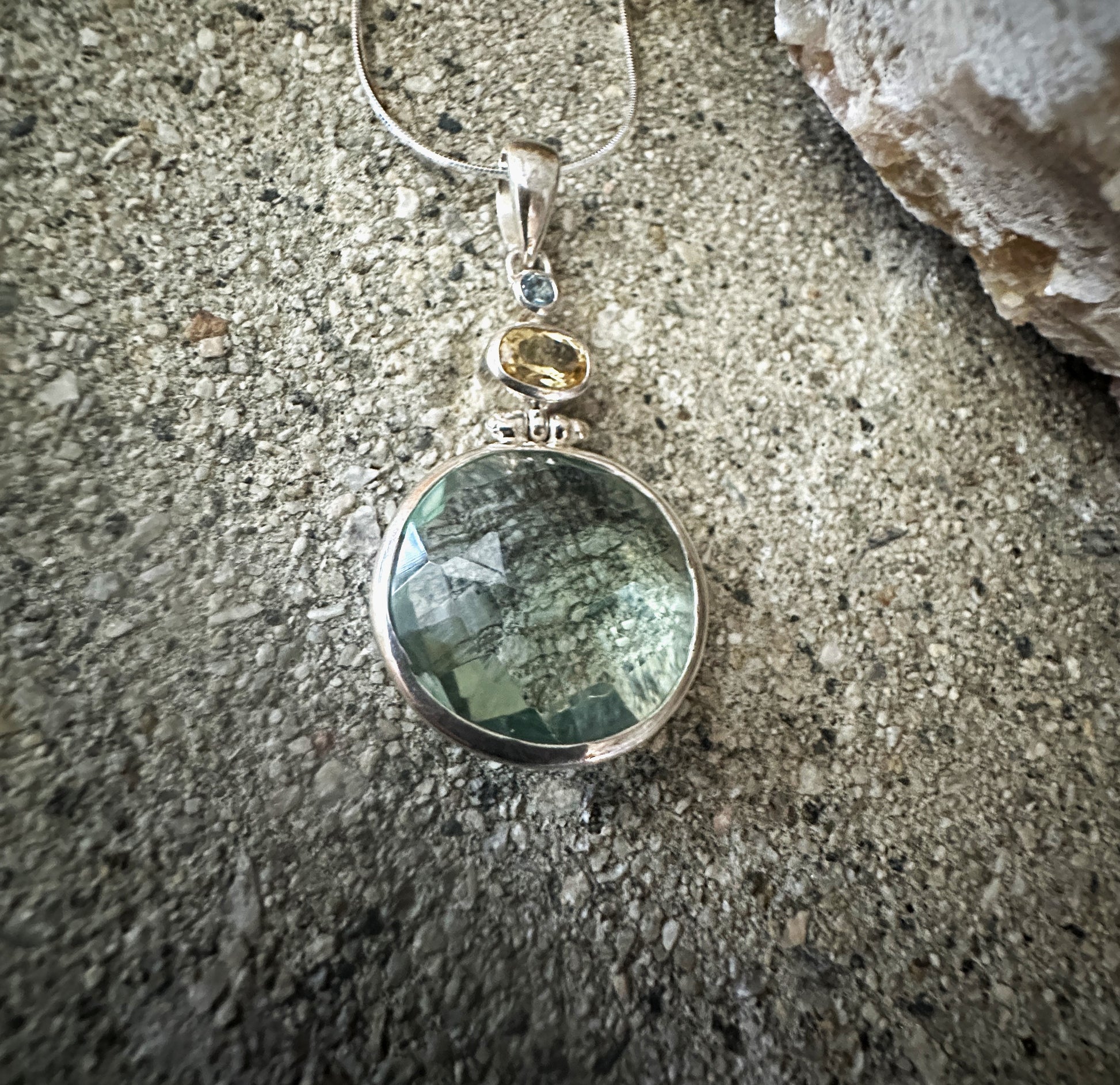 Green obsidian faceted with citrin and blue topaz sterling silver pendant on snake chain.
