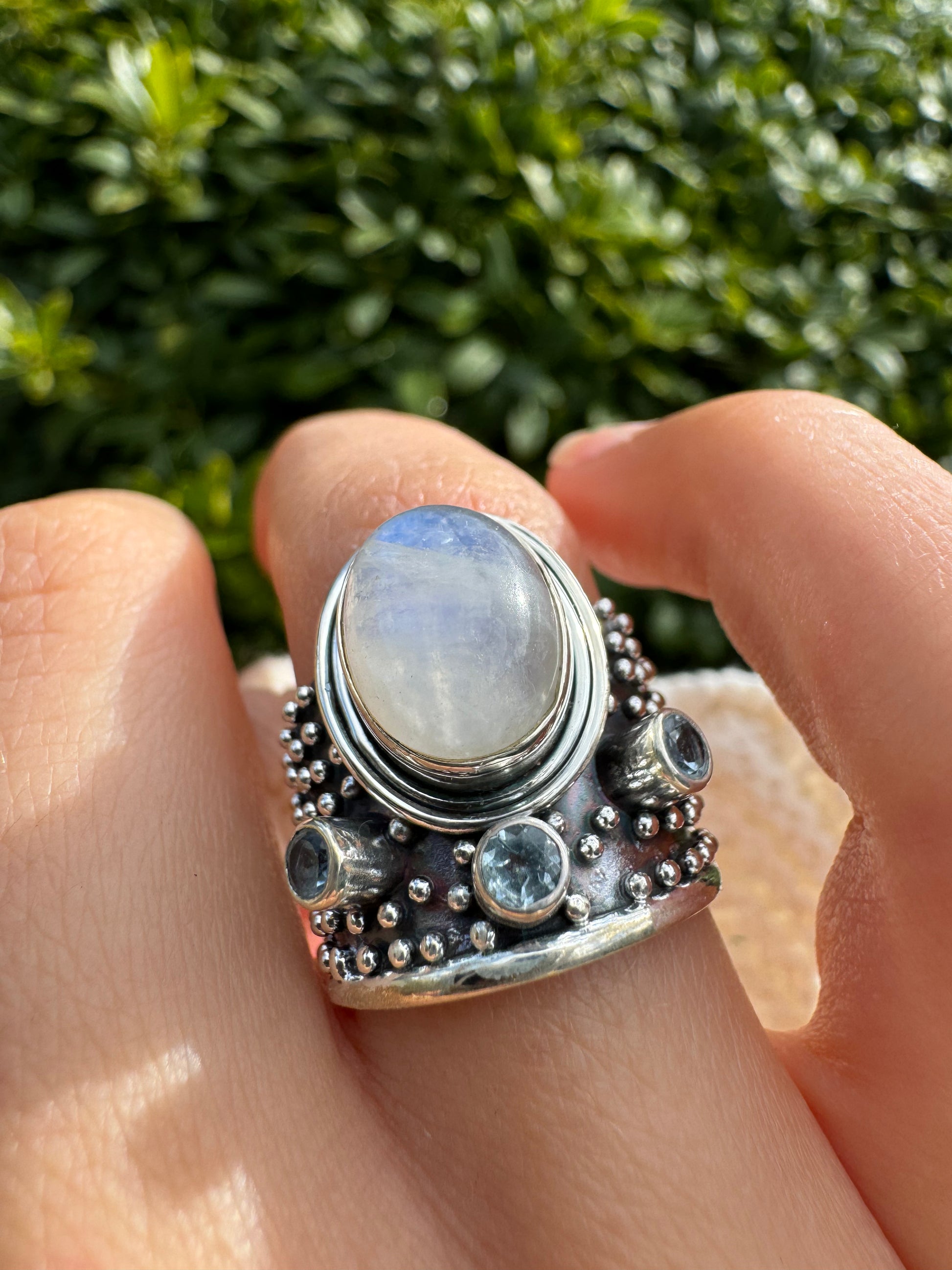 This sterling silver ring features a luminous moonstone paired with three radiant blue topaz gems, creating a heavenly harmony of light and color. Symbolizing intuition and serenity, moonstone glows with ethereal beauty, while blue topaz brings clarity and calm.