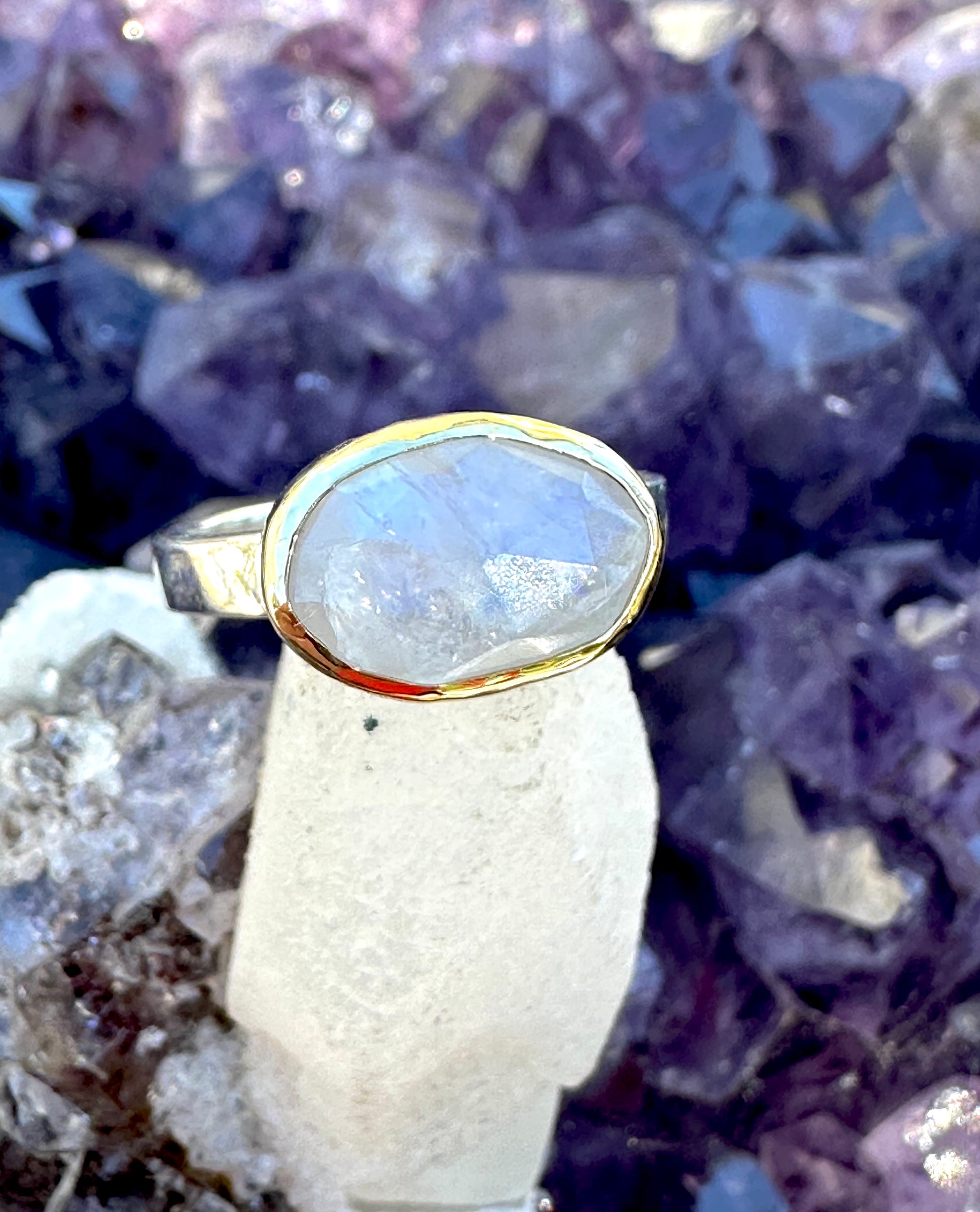 Solid gold & sterling silver faceted moon stone ring.
