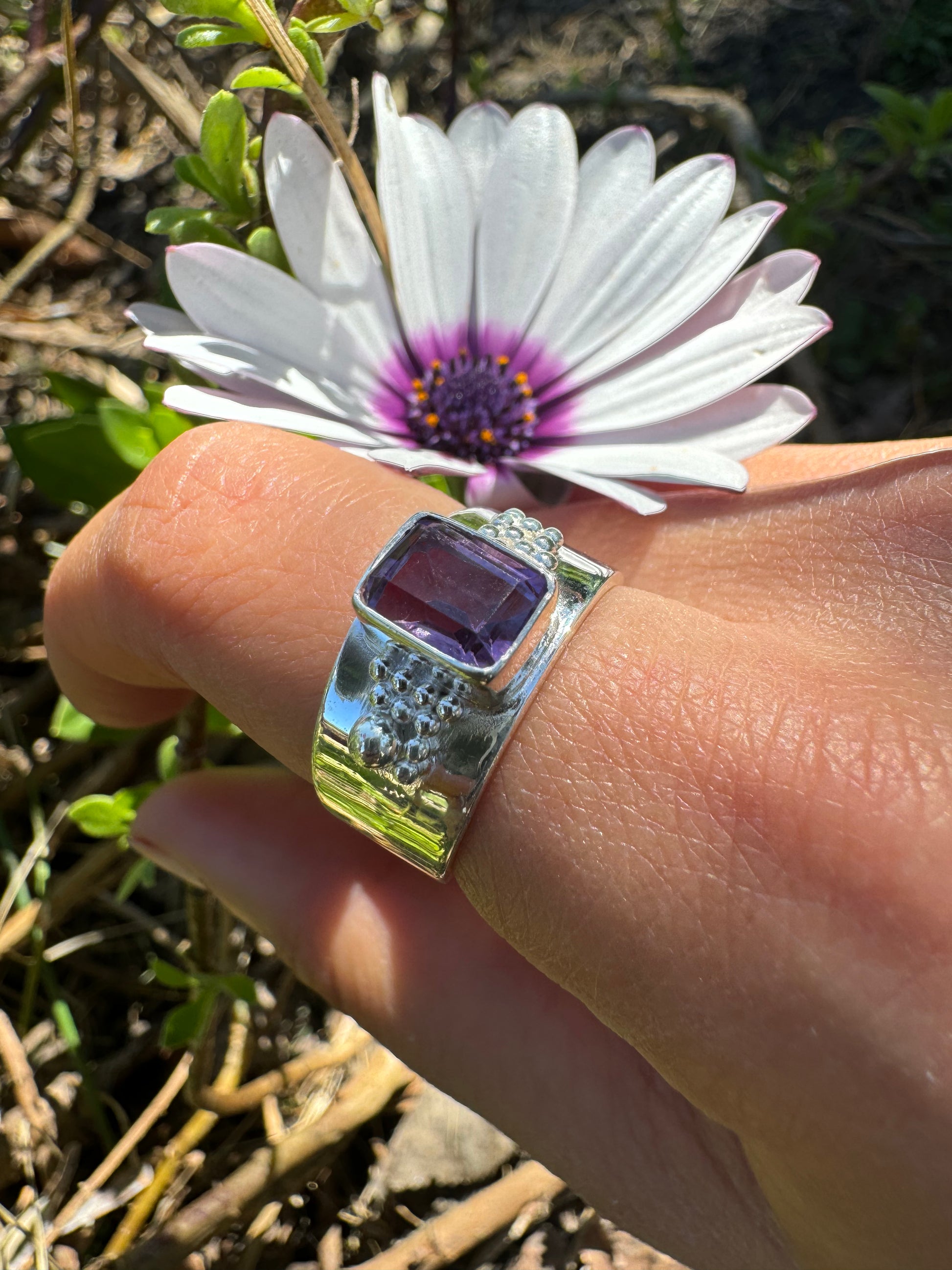 A sterling silver ring featuring a bold square amethyst stone, radiating a deep, calming purple hue. Known for its tranquil energy, amethyst brings clarity and balance.