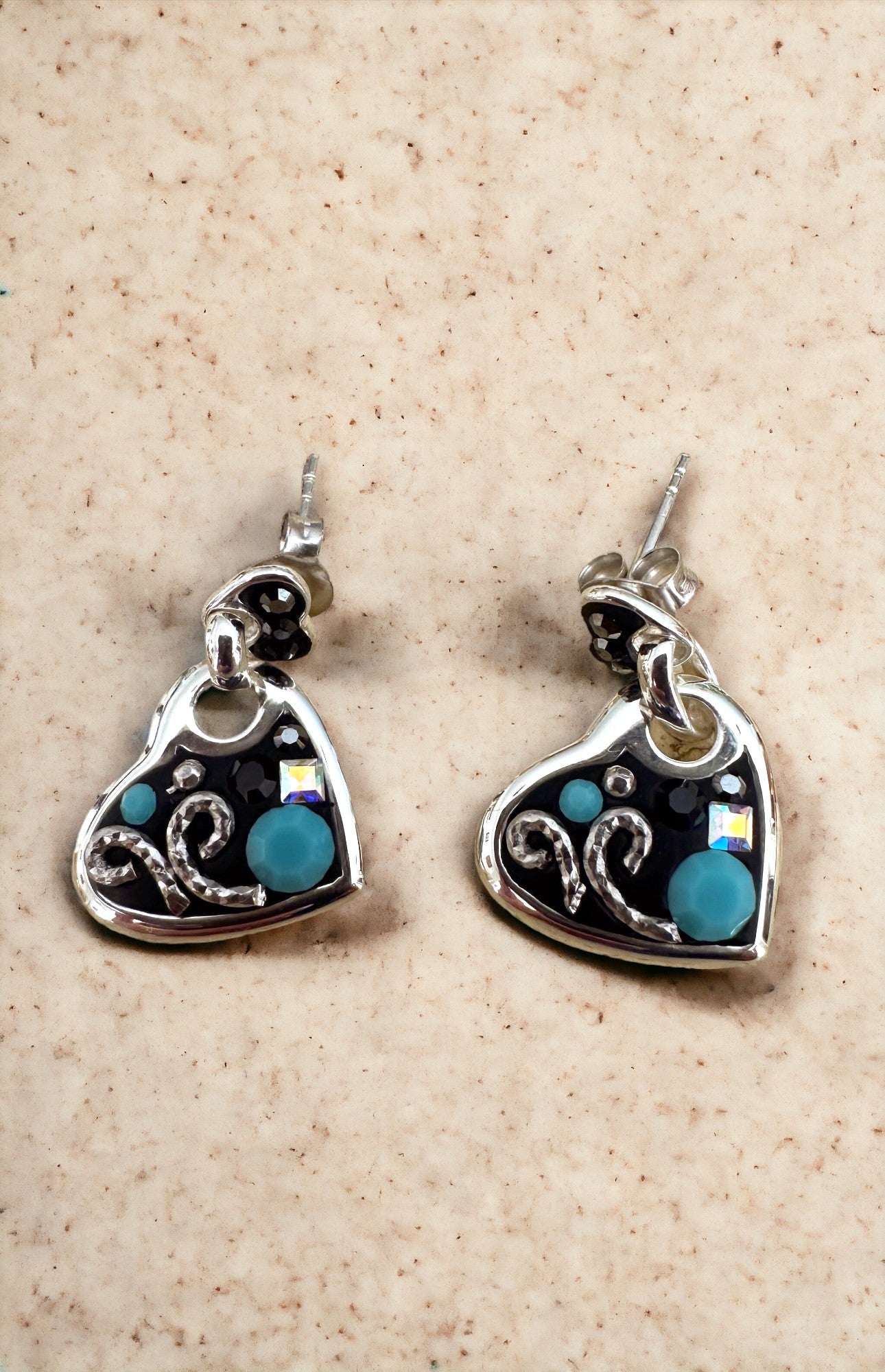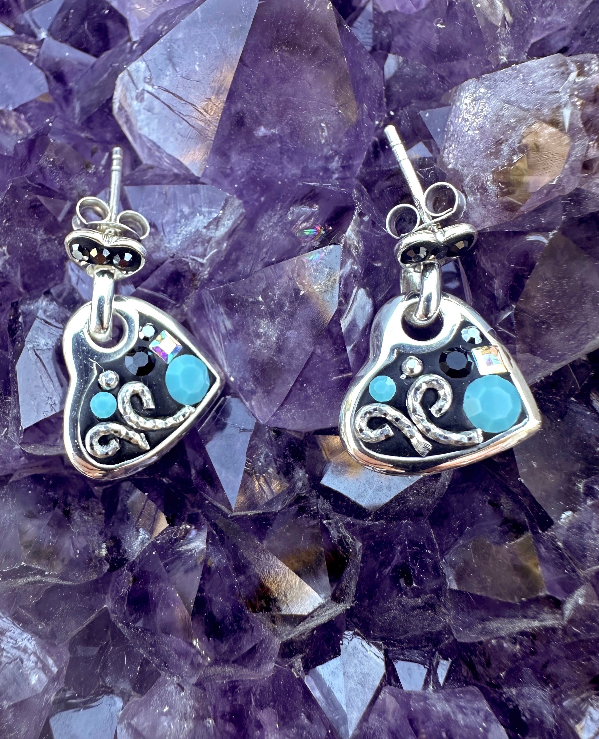 Black and turquoise Austrian Crystal sterling silver heart earrings.