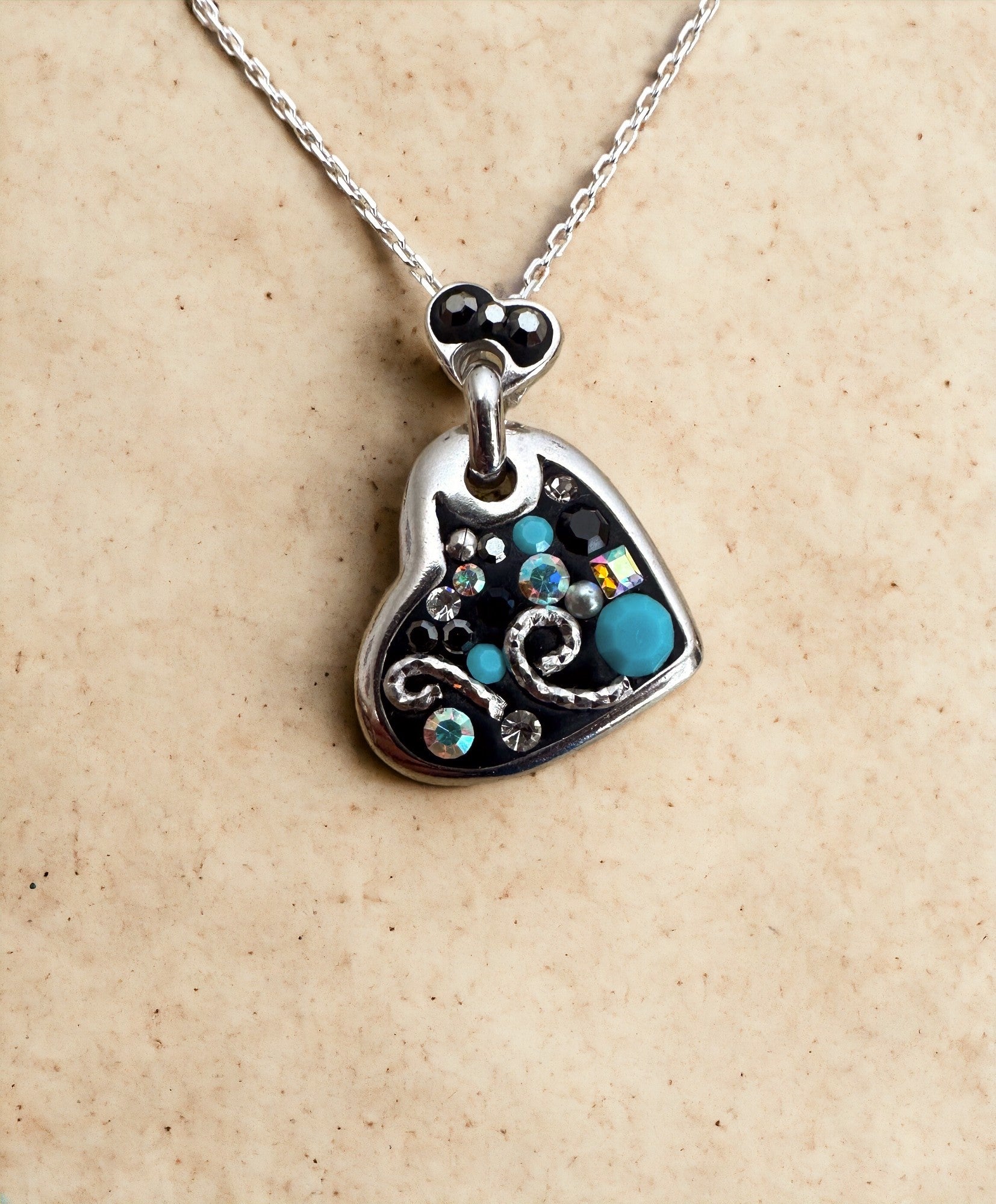 Black and turquoise Austrian Crystal sterling silver heart pendant on chain.