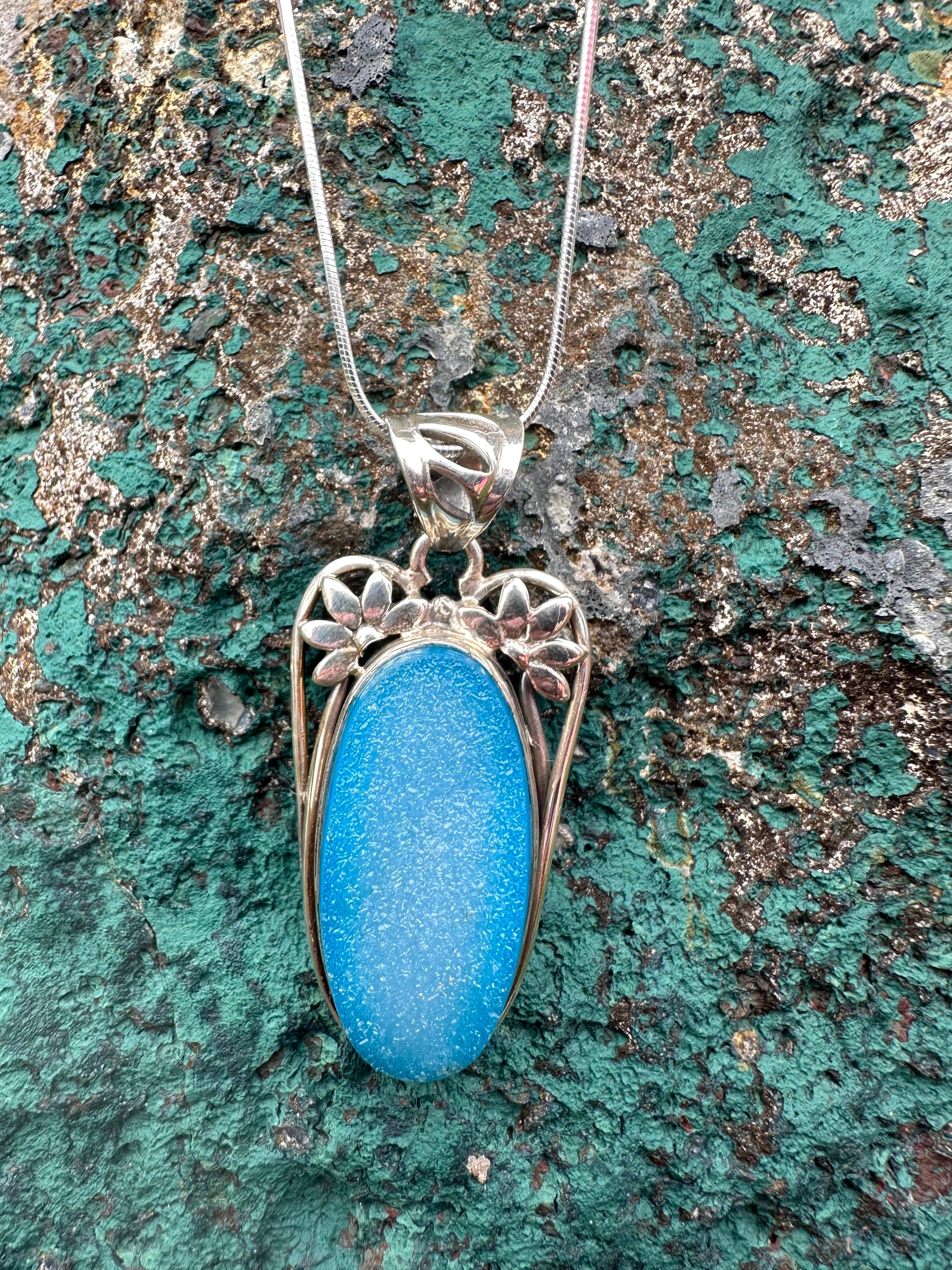Sterling silver blue druzy sterling pend on snake chain.