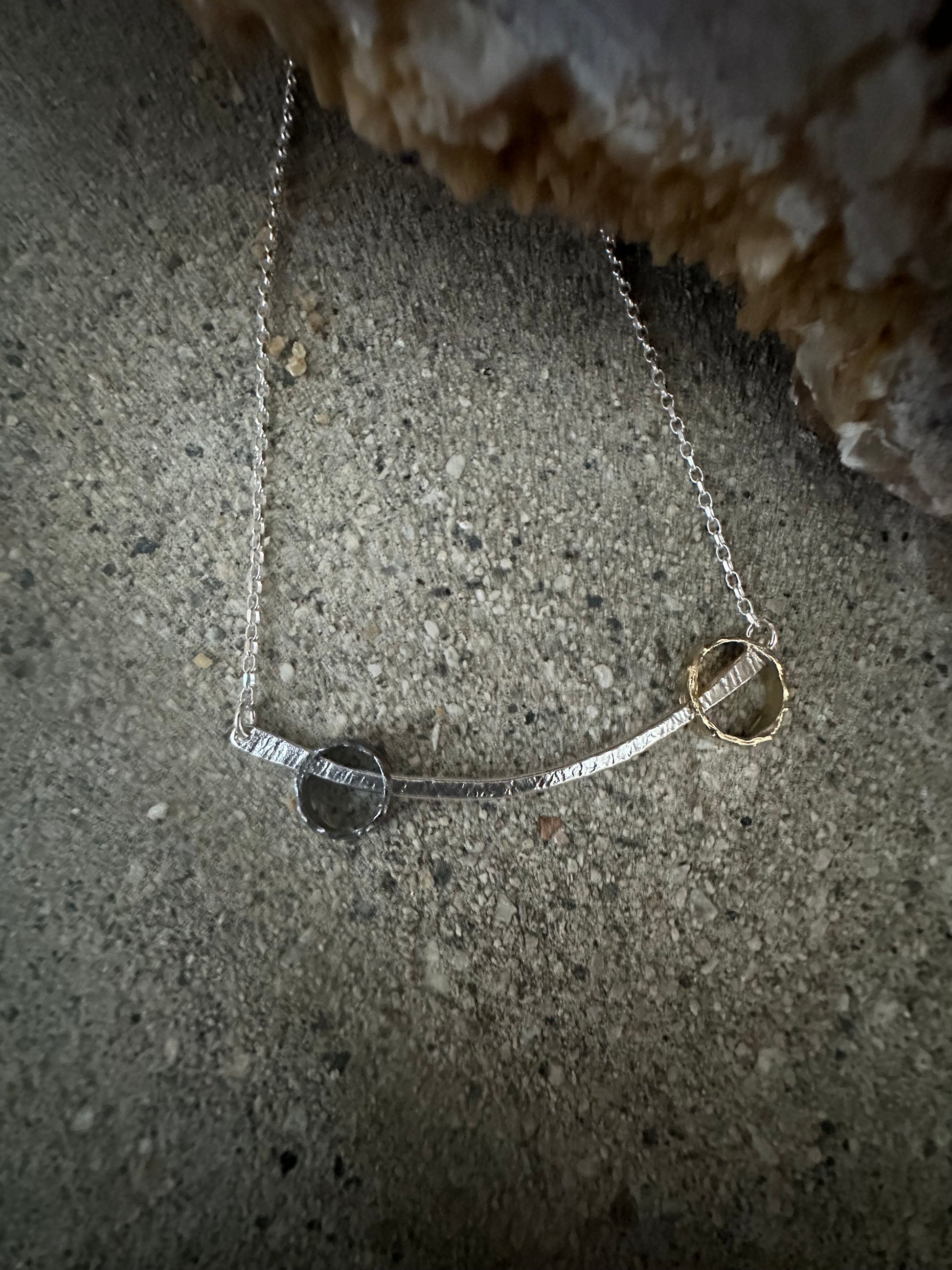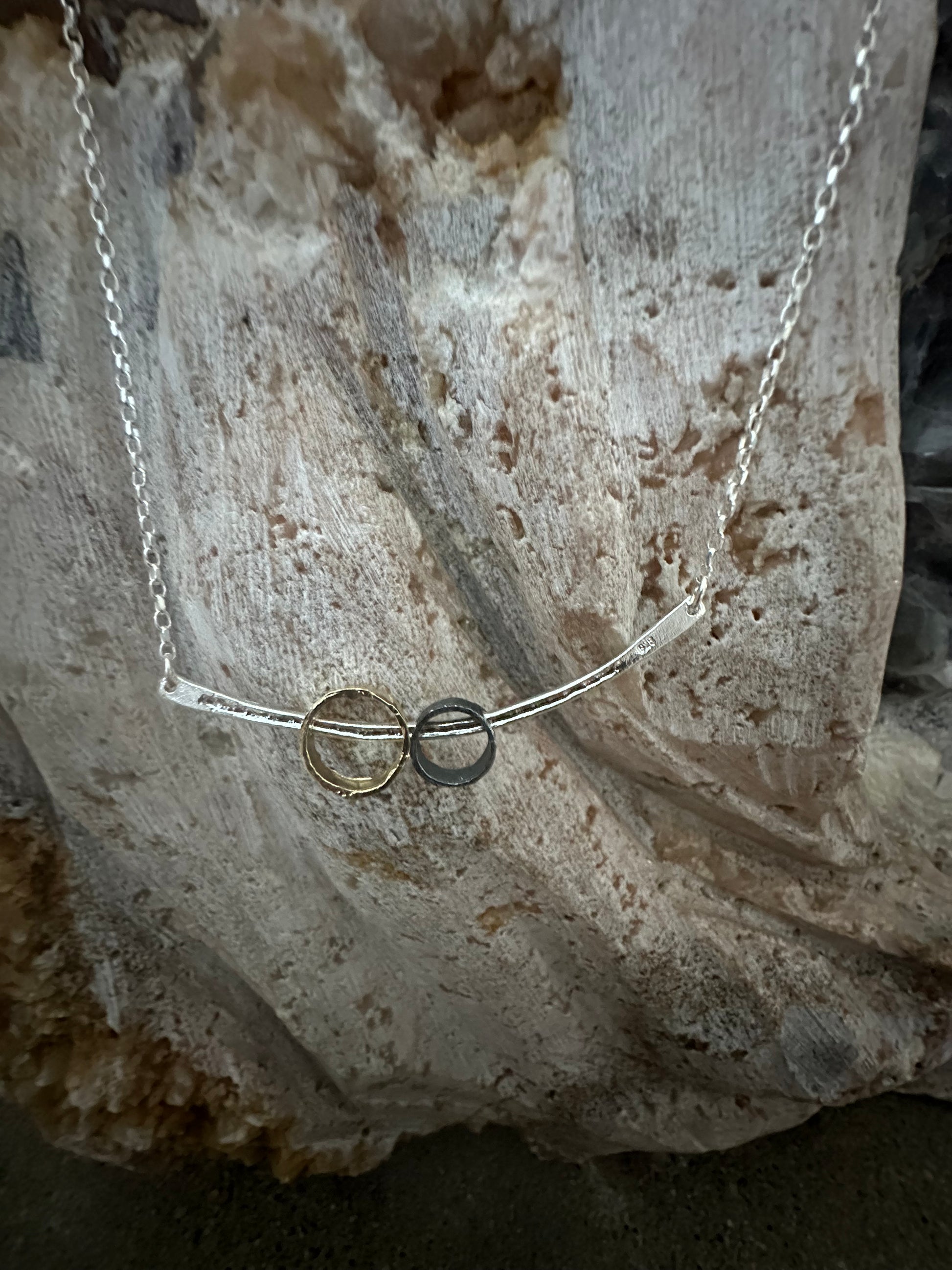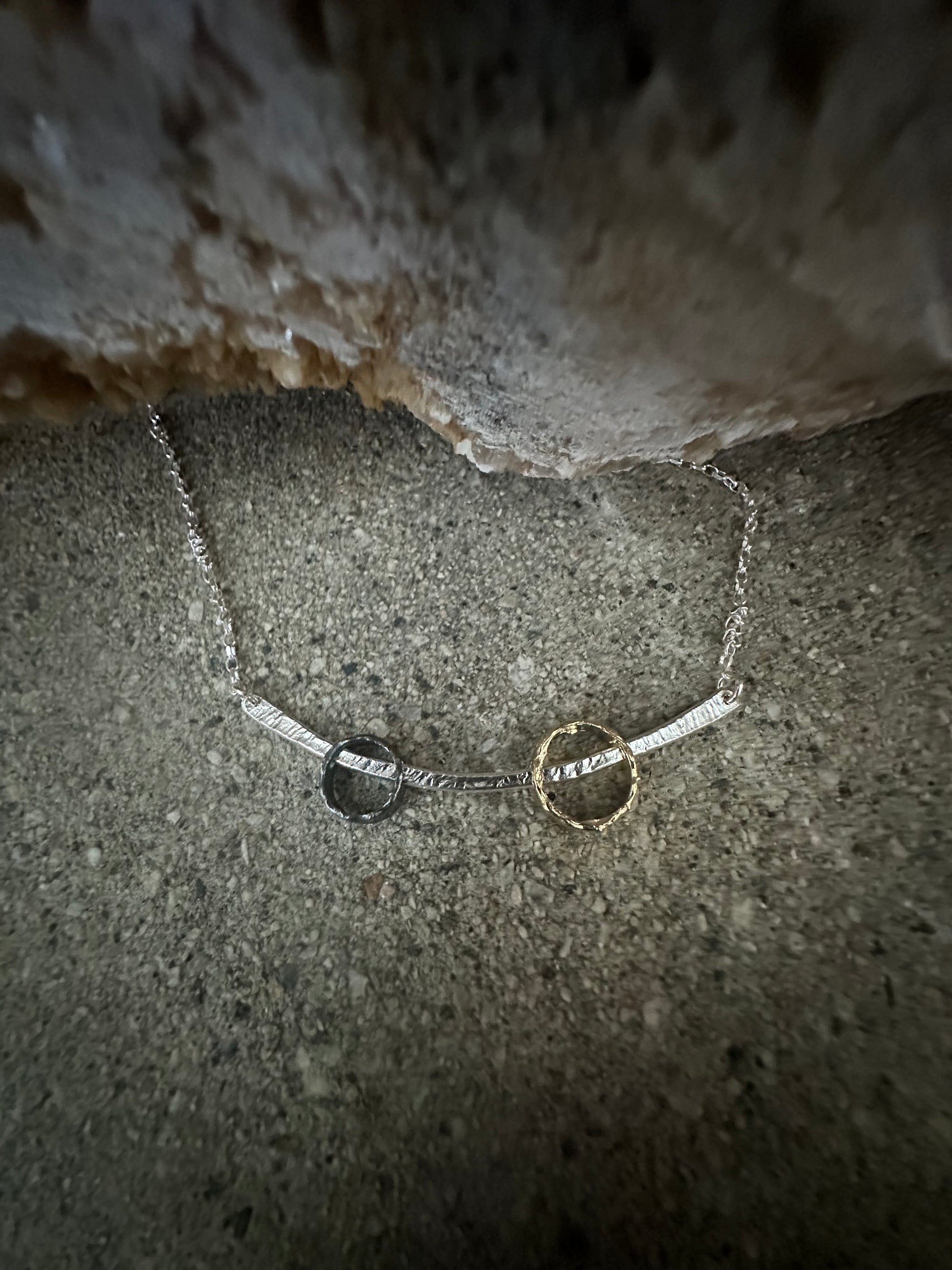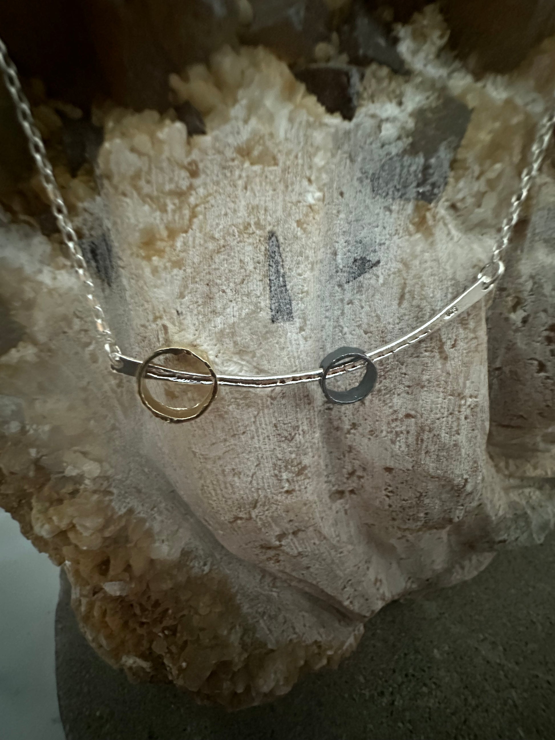 Gold plated circle, oxidized circle on sterling silver wire necklace.