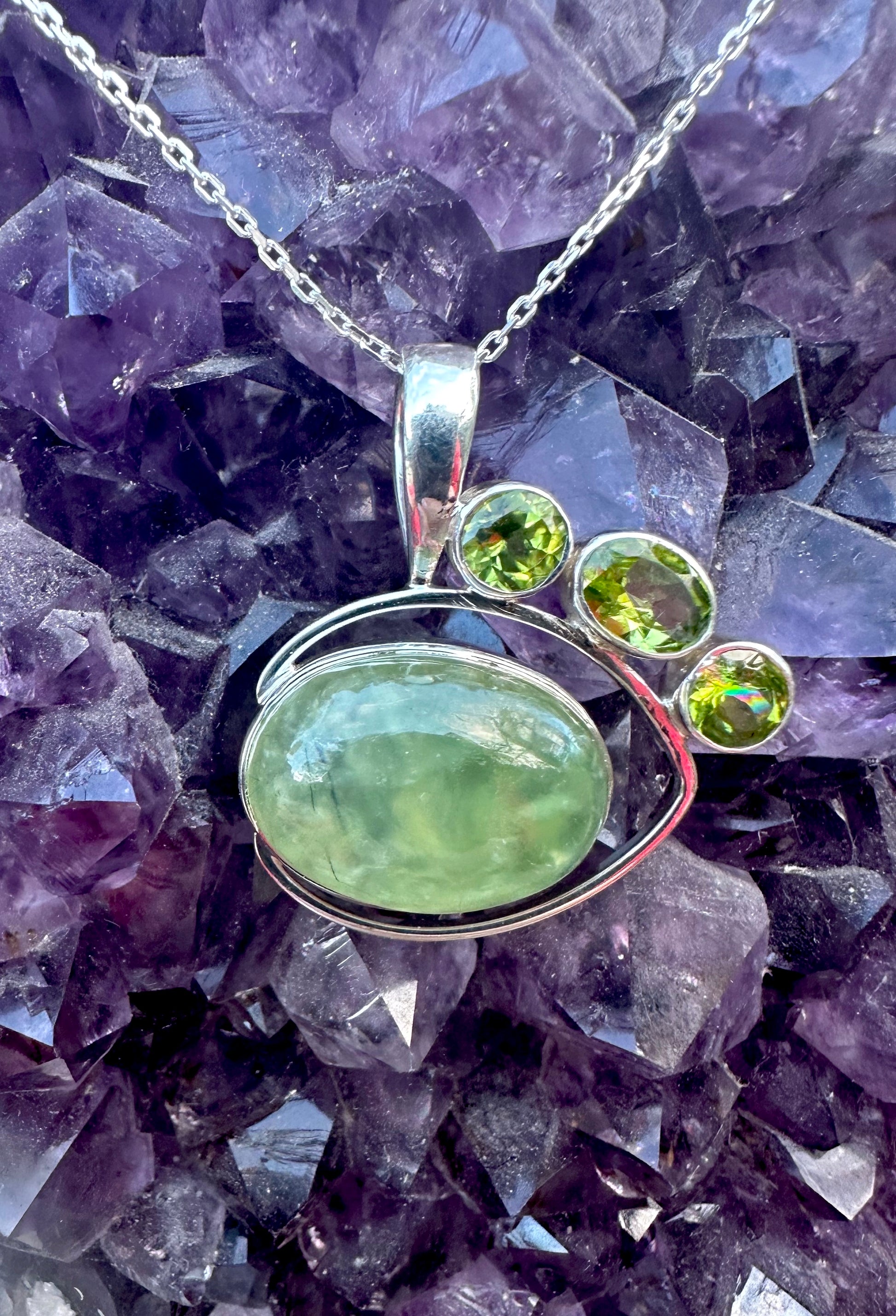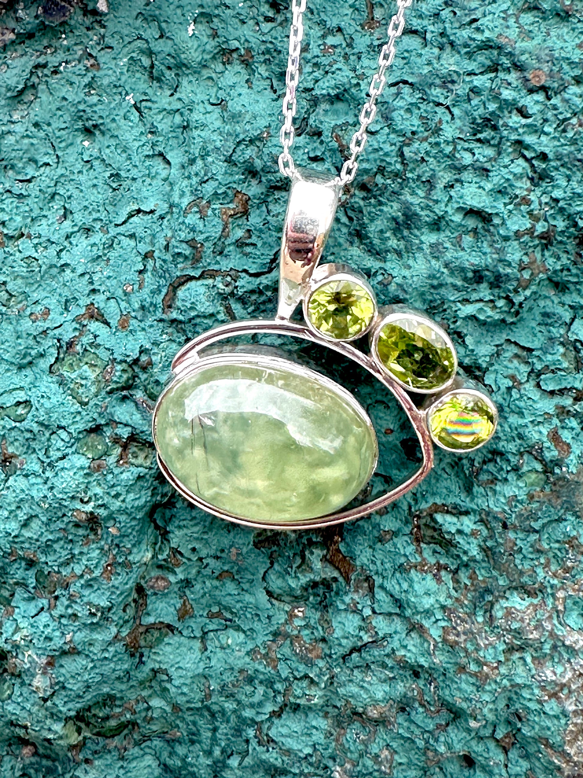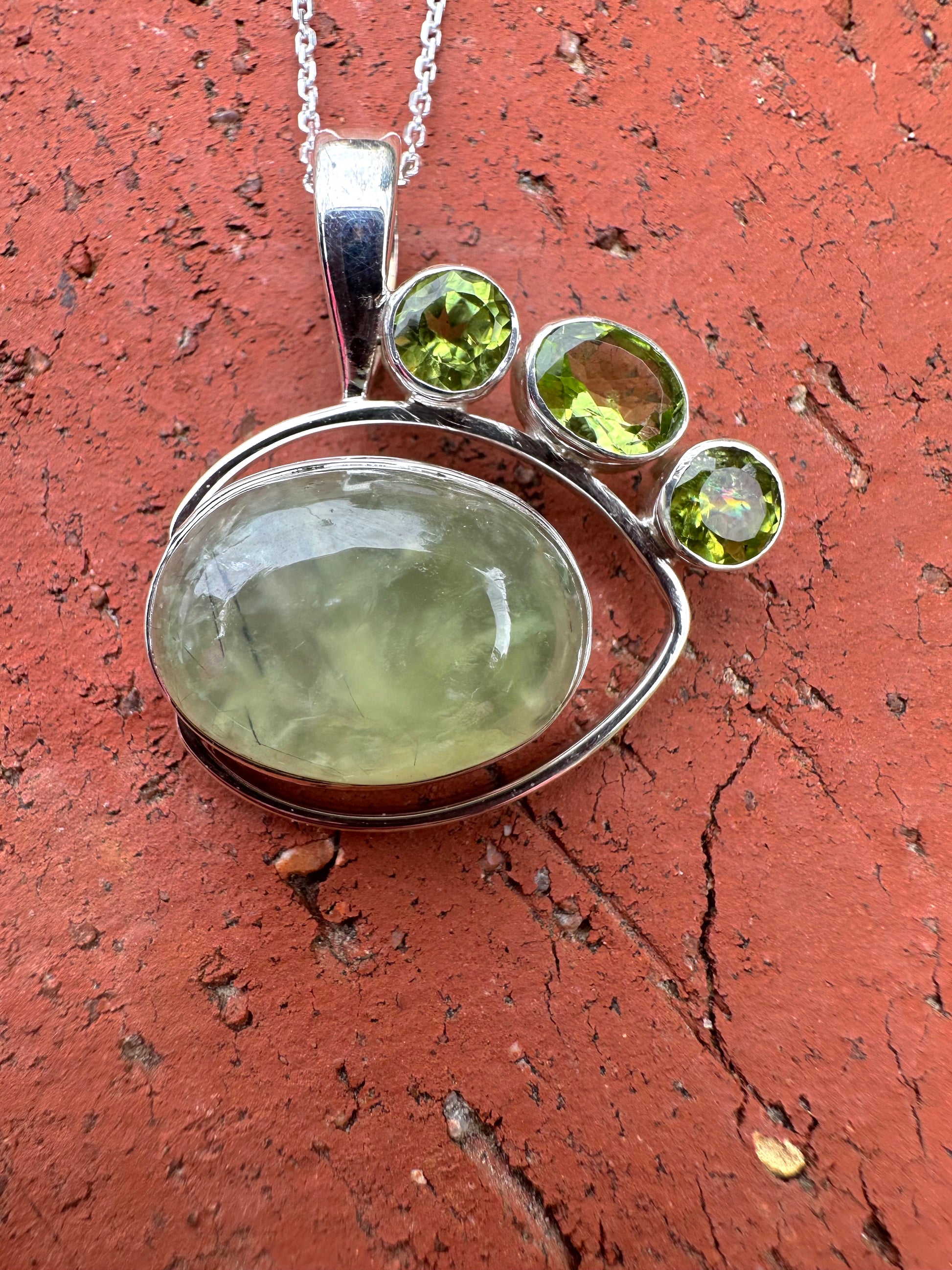 Green Quartz & 3 Peridot Druzy Sterling Silver Necklace