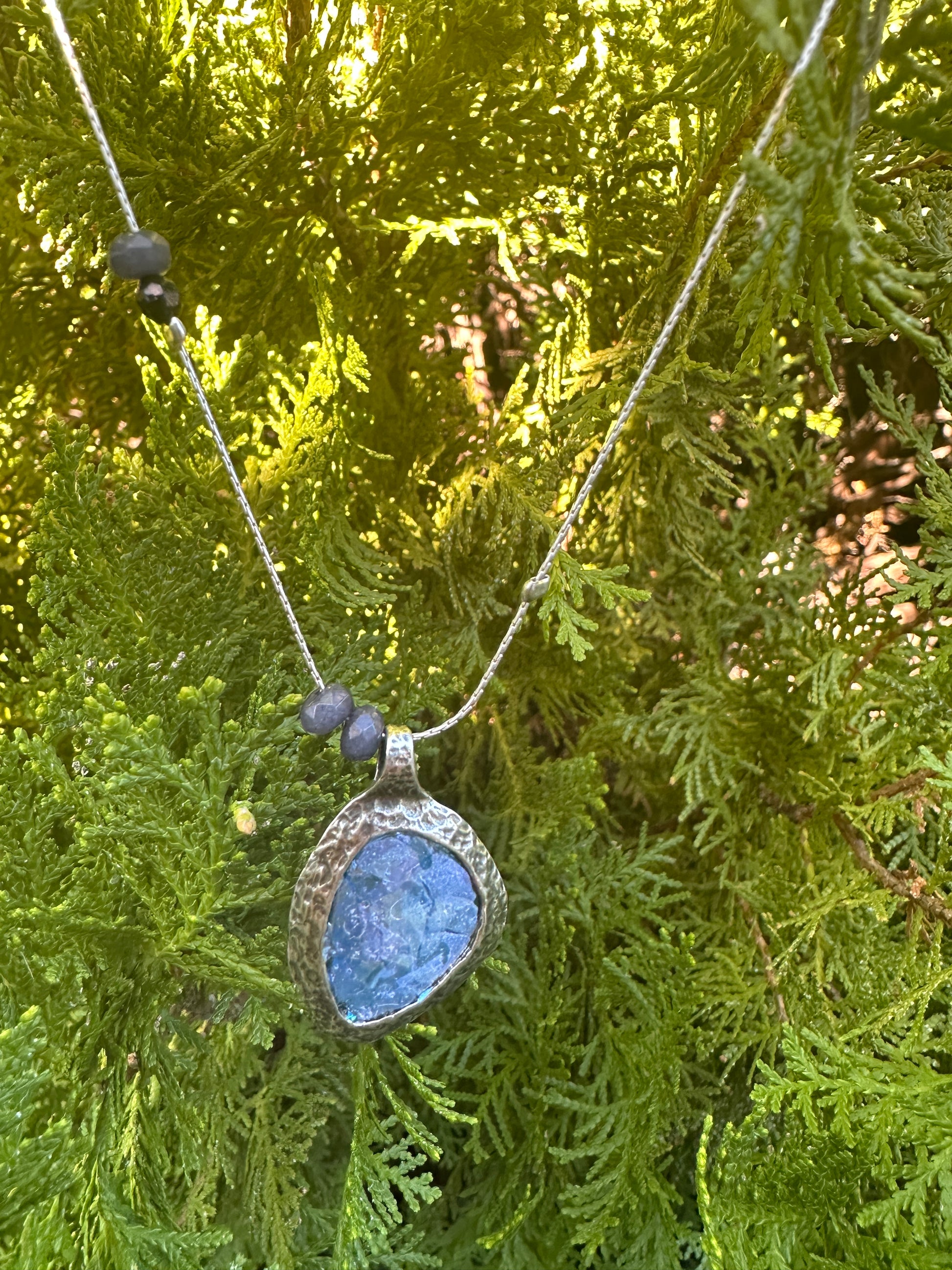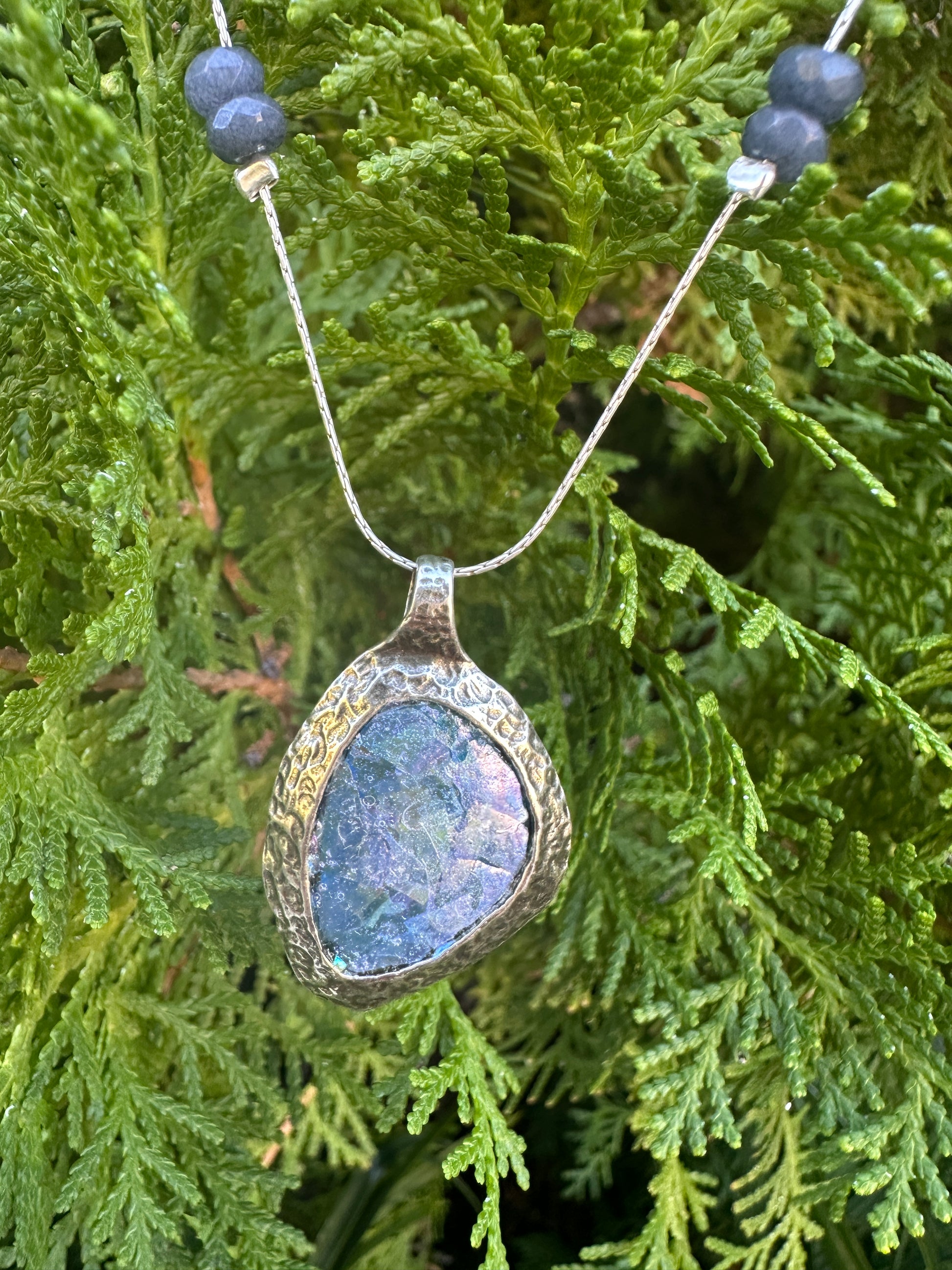 Unpolished ancient Roman Glass set in rugged silver bezel on sterling silver chain with 2 onyx beads and 8 Kyanite stone necklace.