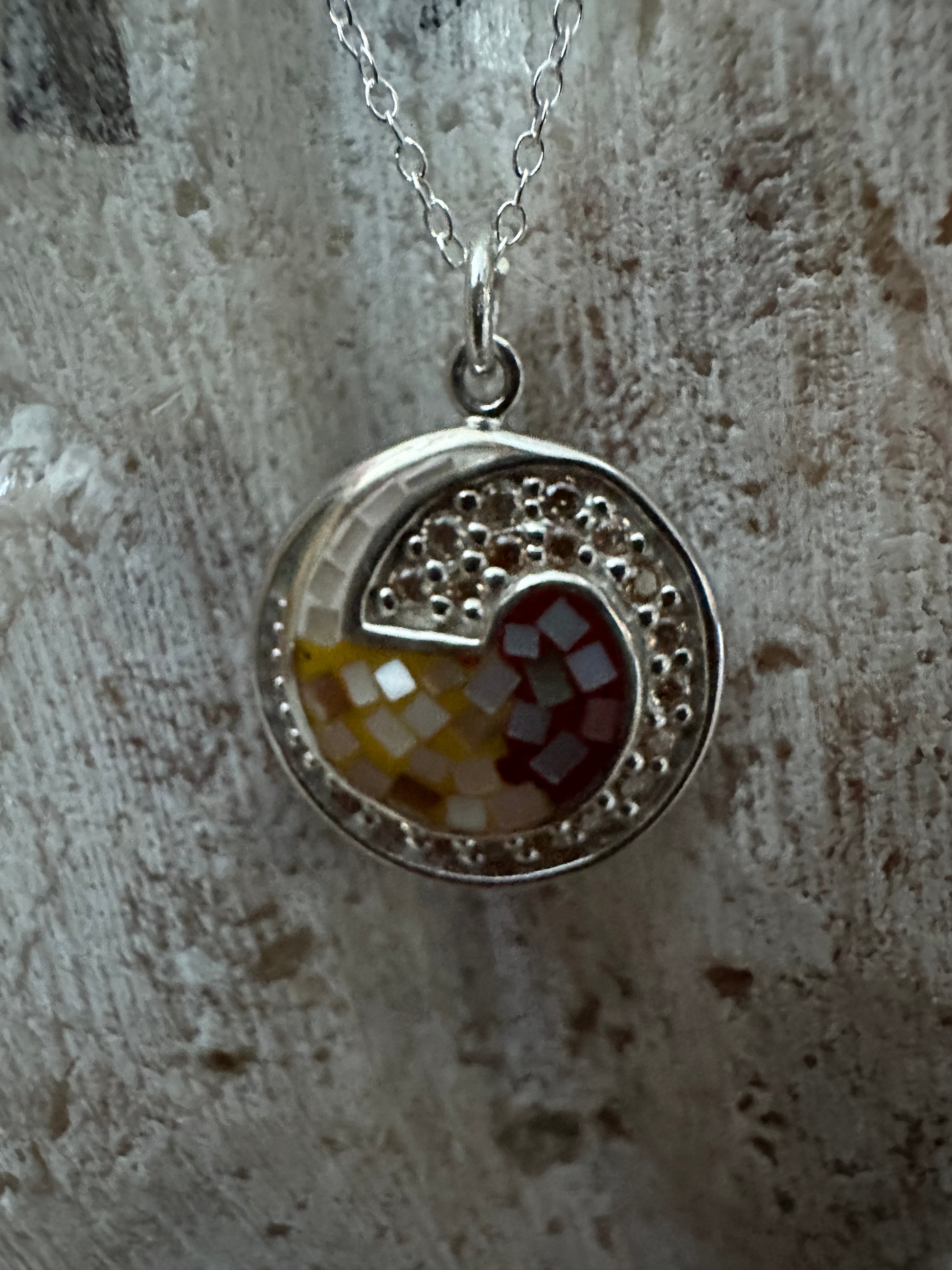 Sterling Silver & Mosaic round pendant on stterling silver thine chain necklace. terracotta red,soft ivory and golden yellow,polished siver with deilcate beaded detaling.