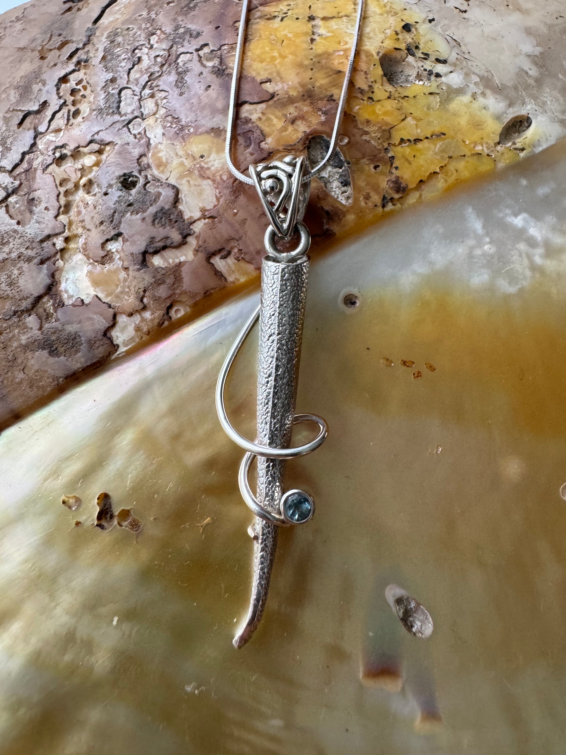 This sterling silver necklace features a stunning small blue topaz set in a unique matte wire cone design.