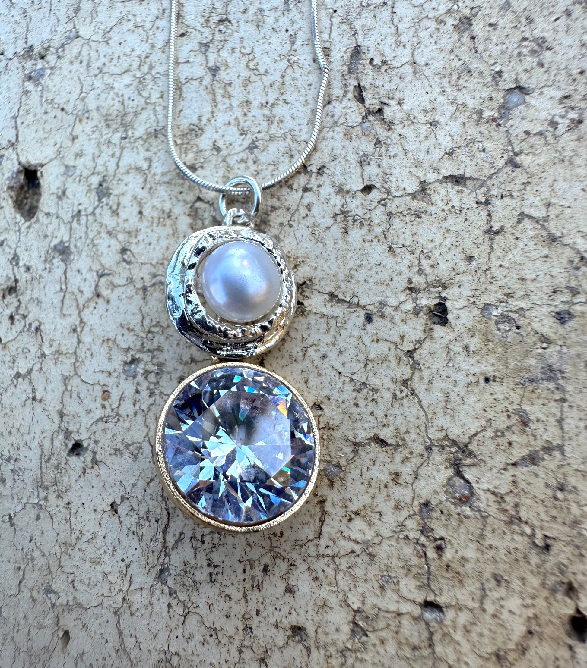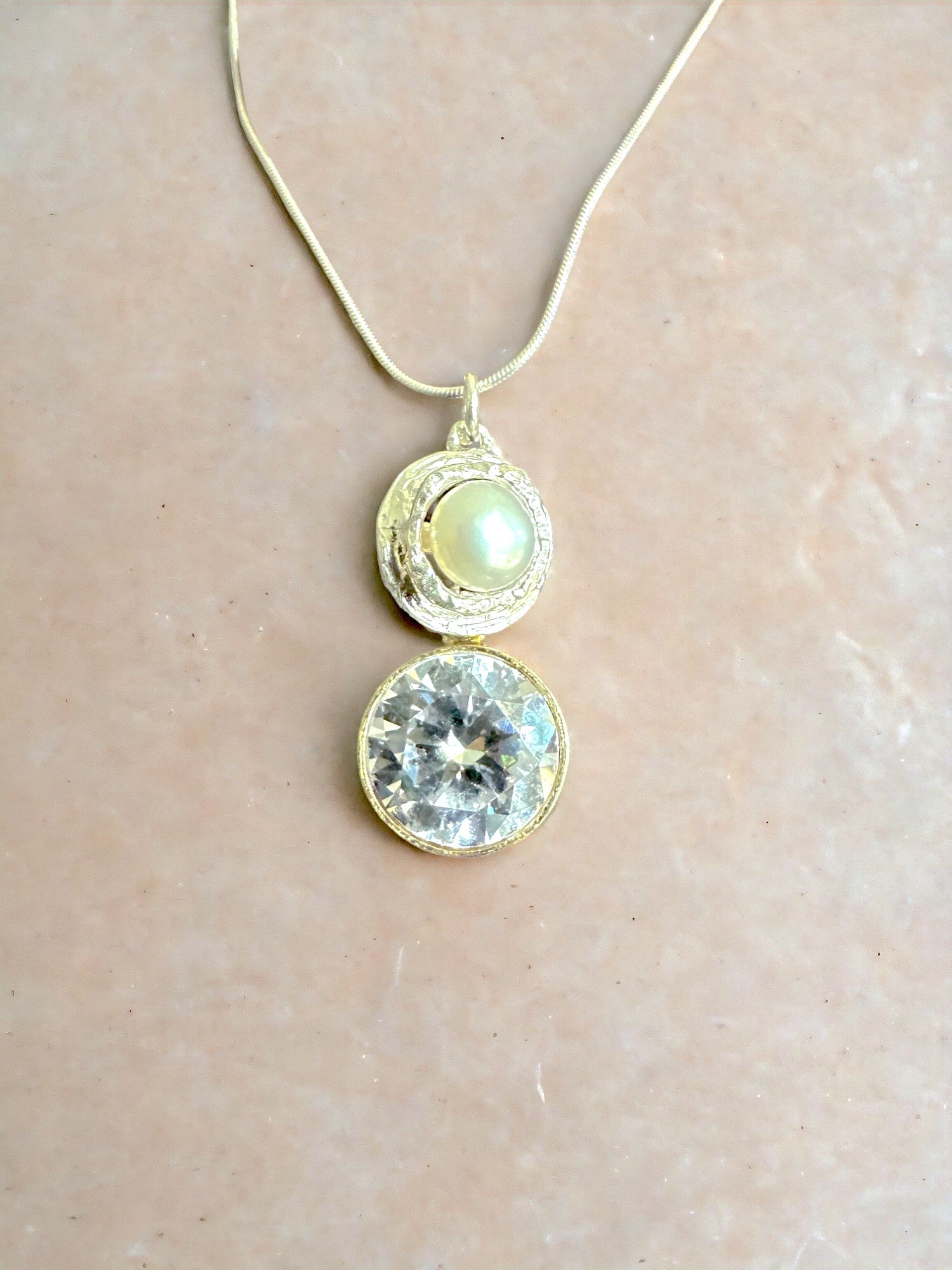Two parts round sterling pearl on top of big round gold plated c.z. pendant on snake chain.